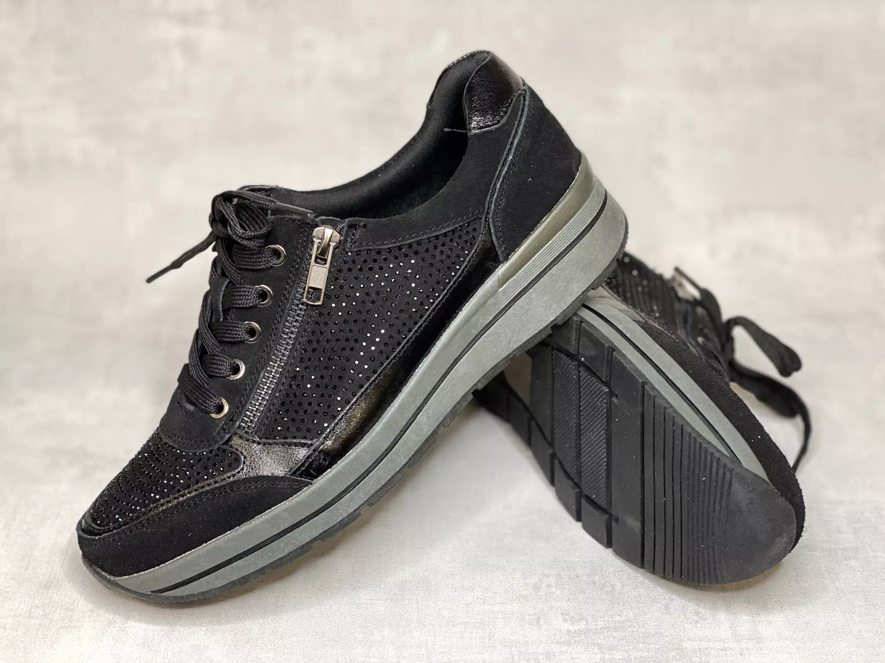 Mustat kiilapohjaiset Natura Kassie Black kävelykengät. Nauhalliset pukemista helpottavalla vetoketjulla varustetut kävelykengät. Mokkanahkaiset yksityiskohdat. Strassikoristeinen kärki ja kyljet. Matala kiilapohja.