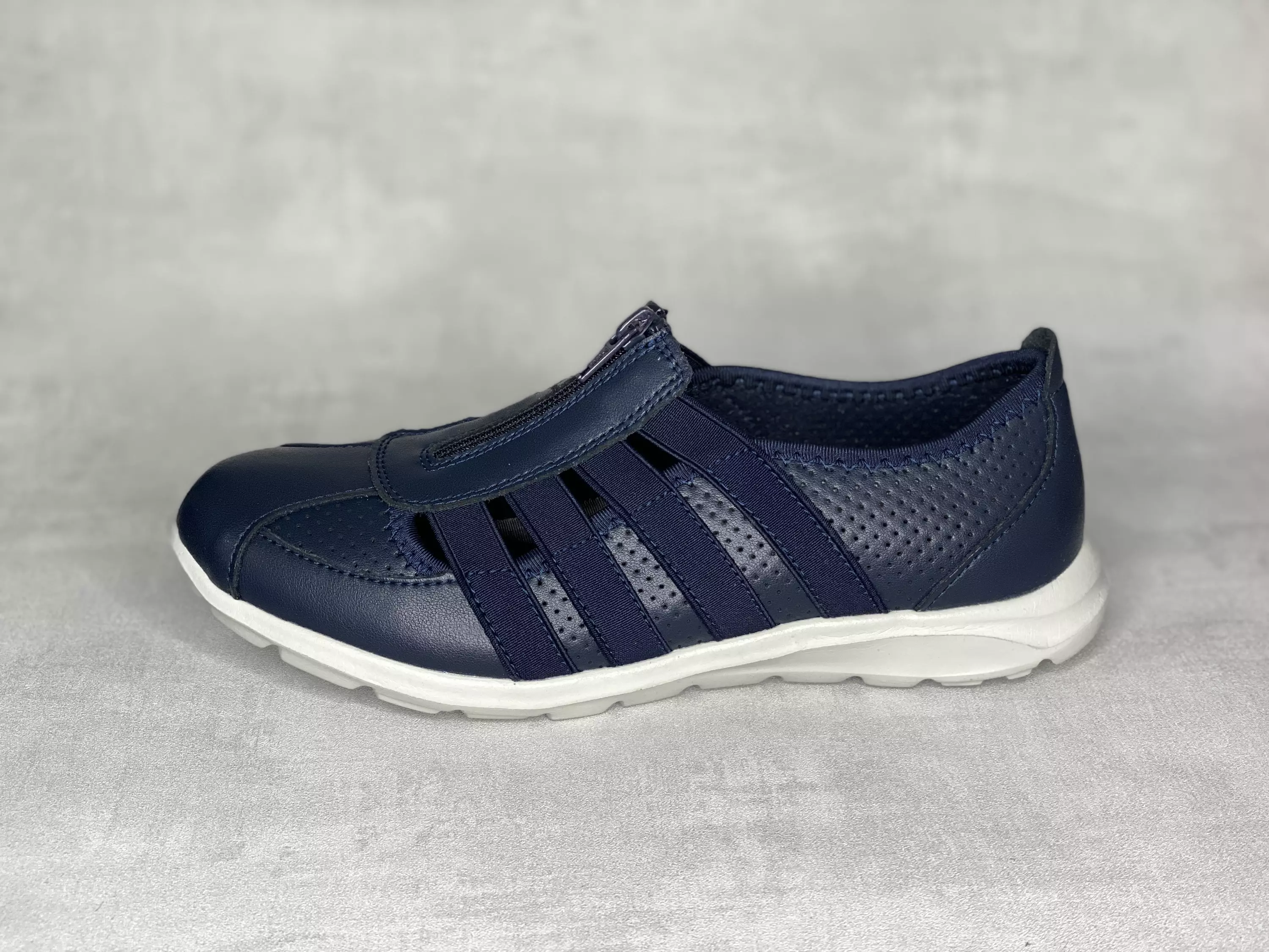 Laivastonsiniset Natura Christine kesäiset kävelykengät. Keskellä edessä vetoketju, joka toimii sekä yksityiskohtana että helpottaa pukemista. Kengän sisä- ja ulkosyrjällä on istuvuutta parantavat venykkeet. Kengän pohjallinen on kevyesti muotoiltu. Kantapään kohdalla on hieman paksumpi pehmuste, jonka lisäksi pohjallisessa on pieni holvikaaren tuki. Pohjallinen on vaihdettavissa, joten tarpeen vaatiessa sen tilalle sujahtaa omaan jalkaasi parhaiten sopiva pohjallinen.