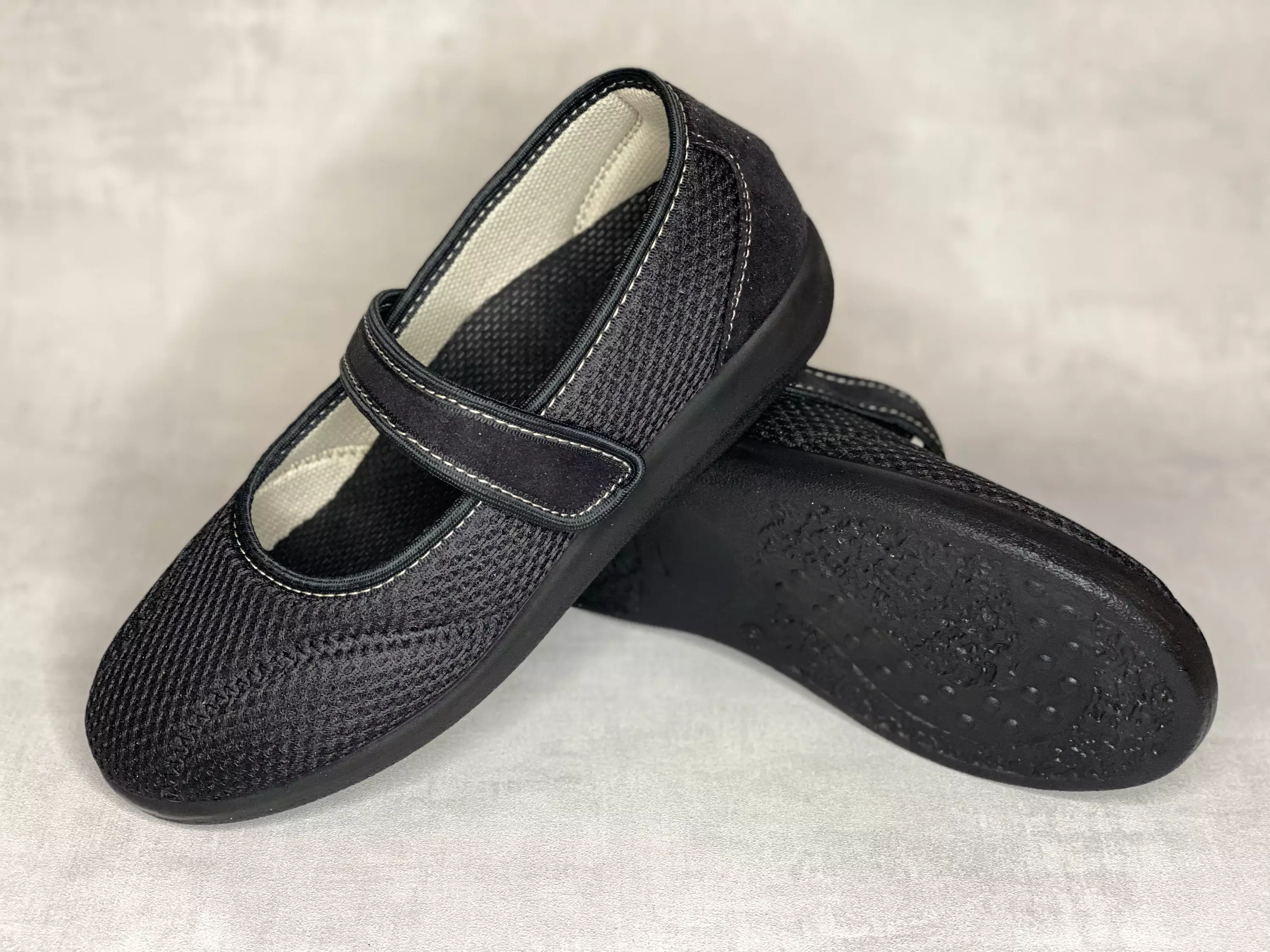 Pehmeät ja kevyet, leveälestiset mustat OrtoMed kengät, jossa tarrallinen remmi. Hengittävä tekstiilipäällinen. Irrotettava muotopohjallinen on helppo vaihtaa tarvittaessa tukipohjallisiin. Sopivat sisä- ja ulkokäyttöön.