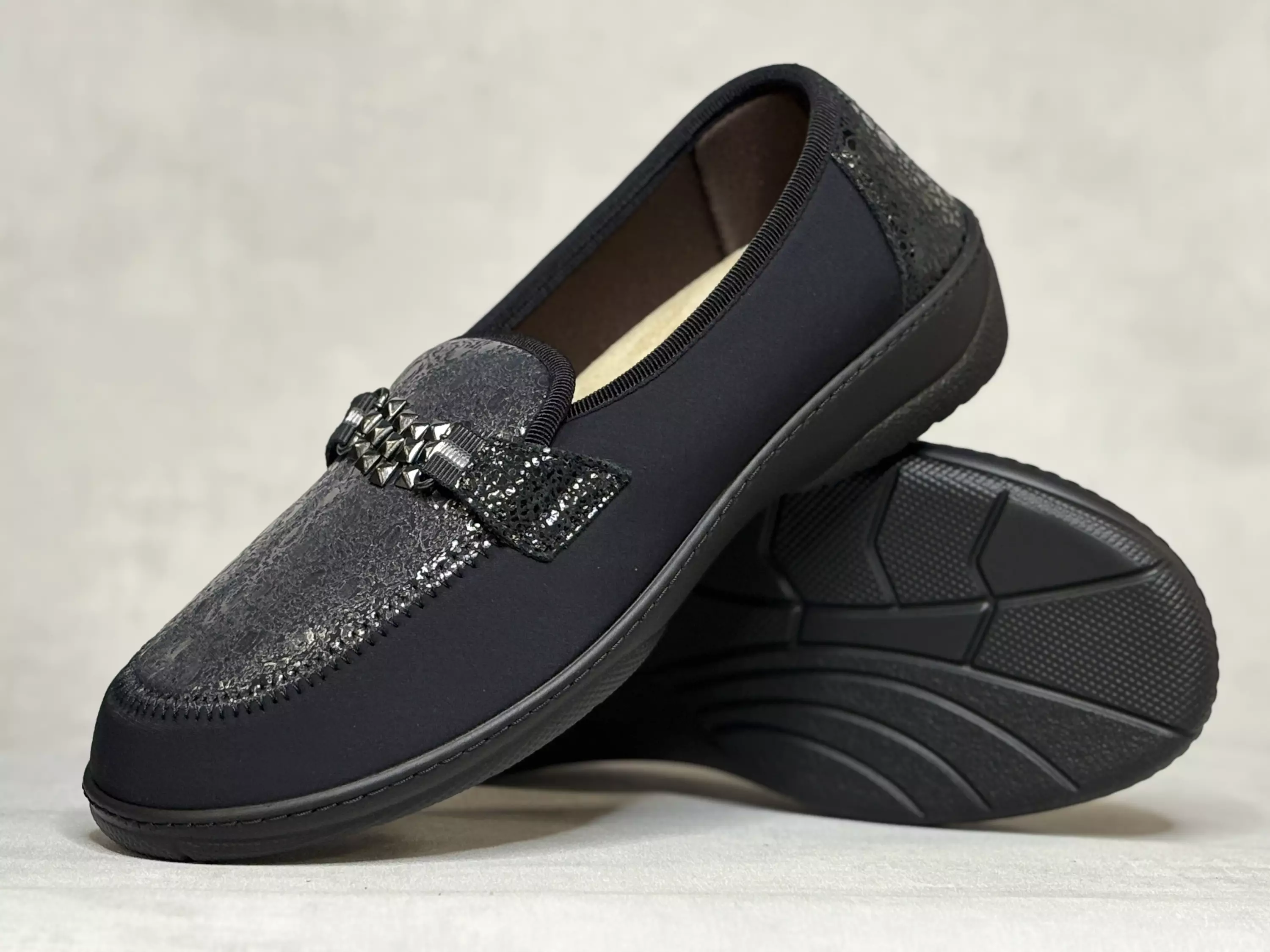 Mustat Podowell Magik kävelykengät. Laajalestiset pehmeät loaferit ovat mainio valinta erikoistarpeiseen jalkaan.