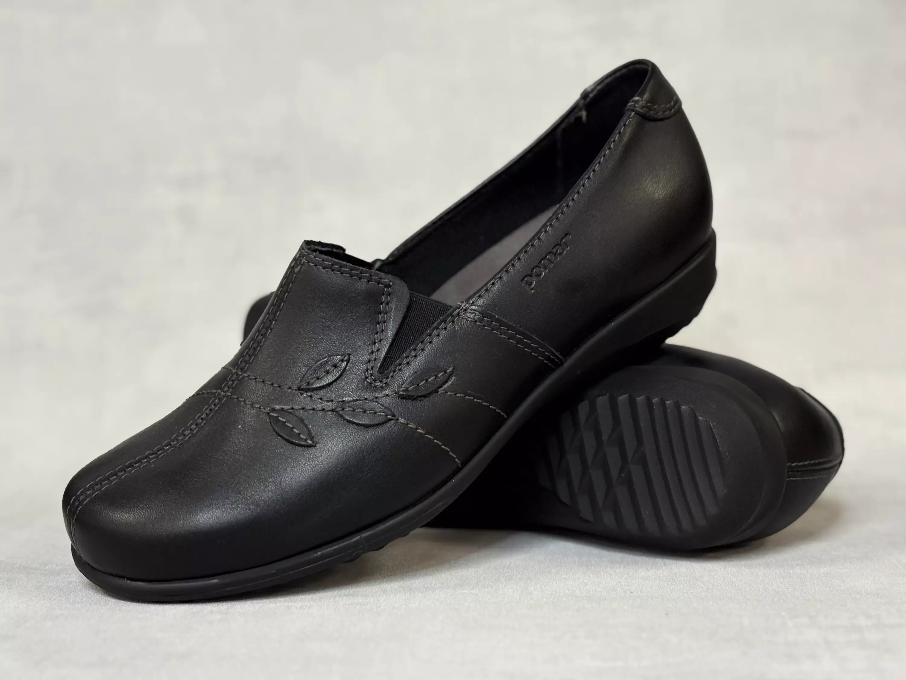 Mustat Pomar SADE naisten kävelykengät. Nahkaiset kävelykengät sievällä lehtikuviolla. Kengän sisä- ja ulkosyrjällä on pukemista helpottavat ja istuvuutta parantavat venykkeet. Muotoillut sisäpohjalliset ovat vaihdettavat, joten tarvittaessa sujautat kenkiin omia tarpeitasi parhaiten vastaavat pohjalliset. Kannan korkeus noin 2,5cm ja pohjan korkeus päkiän alta noin 1cm.