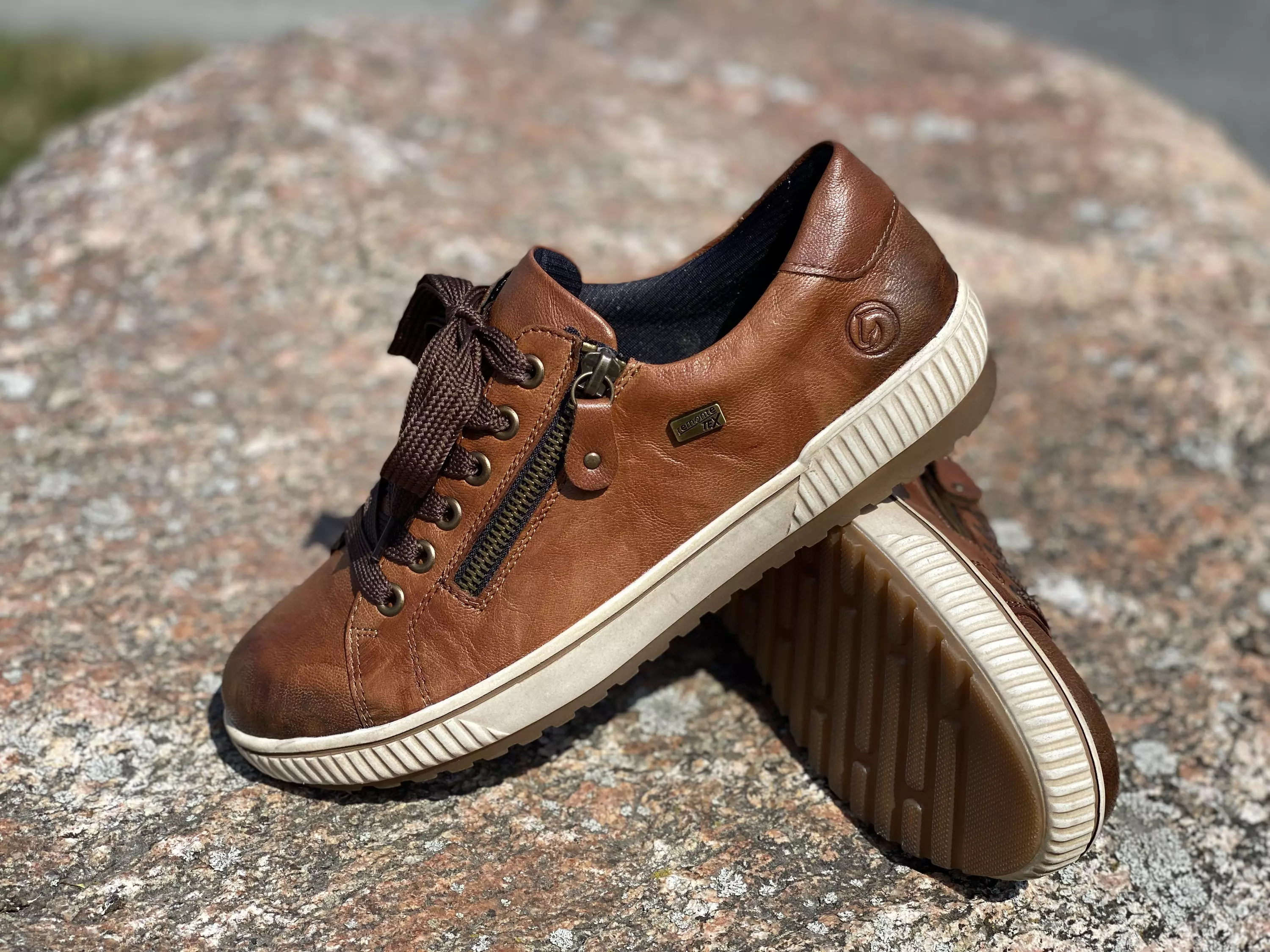 Ruskeat Remonte kävelykengät. Nämä matalavartiset nahkaiset kävelykengät on varustettu nauhoilla ja ulkosyrjälle sijoitetulla pukemista helpottavalla vetoketjulla. RemonteTex pitää varpaat kuivina kosteillakin keleillä. Muotoillut Remonte Sof pohjalliset ovat vaihdettavat, joten tarvittaessa vaihdat kenkiin omia tarpeitasi parhaiten vastaavat pohjalliset. Kannan korkeus noin 3cm ja pohjan korkeus päkiän alta noin 1,5cm.