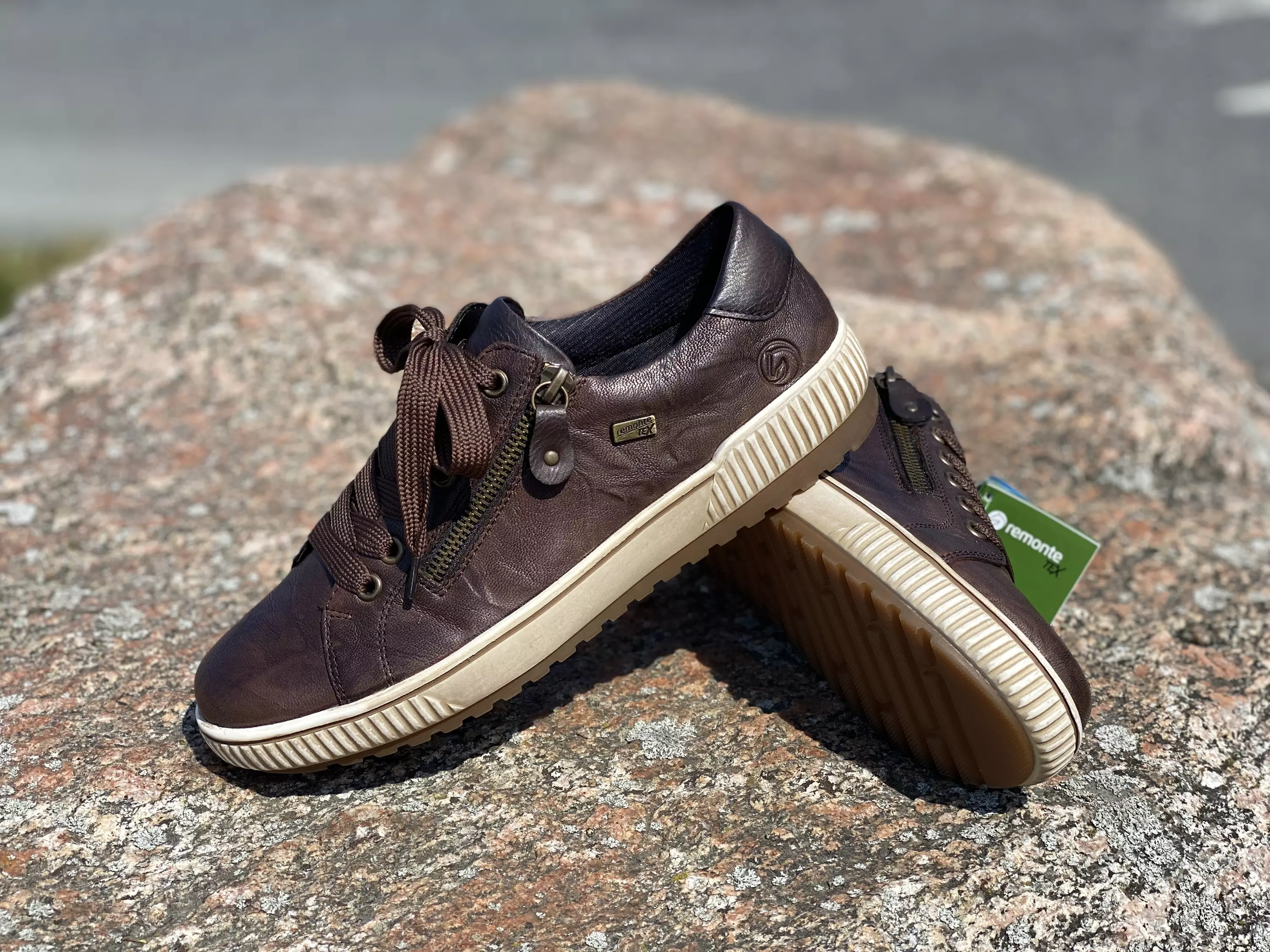 Tummanruskeat Remonte kävelykengät. Nämä matalavartiset nahkaiset kävelykengät on varustettu nauhoilla ja ulkosyrjälle sijoitetulla pukemista helpottavalla vetoketjulla. RemonteTex pitää varpaat kuivina kosteillakin keleillä. Muotoillut Remonte Sof pohjalliset ovat vaihdettavat, joten tarvittaessa vaihdat kenkiin omia tarpeitasi parhaiten vastaavat pohjalliset. Kannan korkeus noin 3cm ja pohjan korkeus päkiän alta noin 1,5cm.