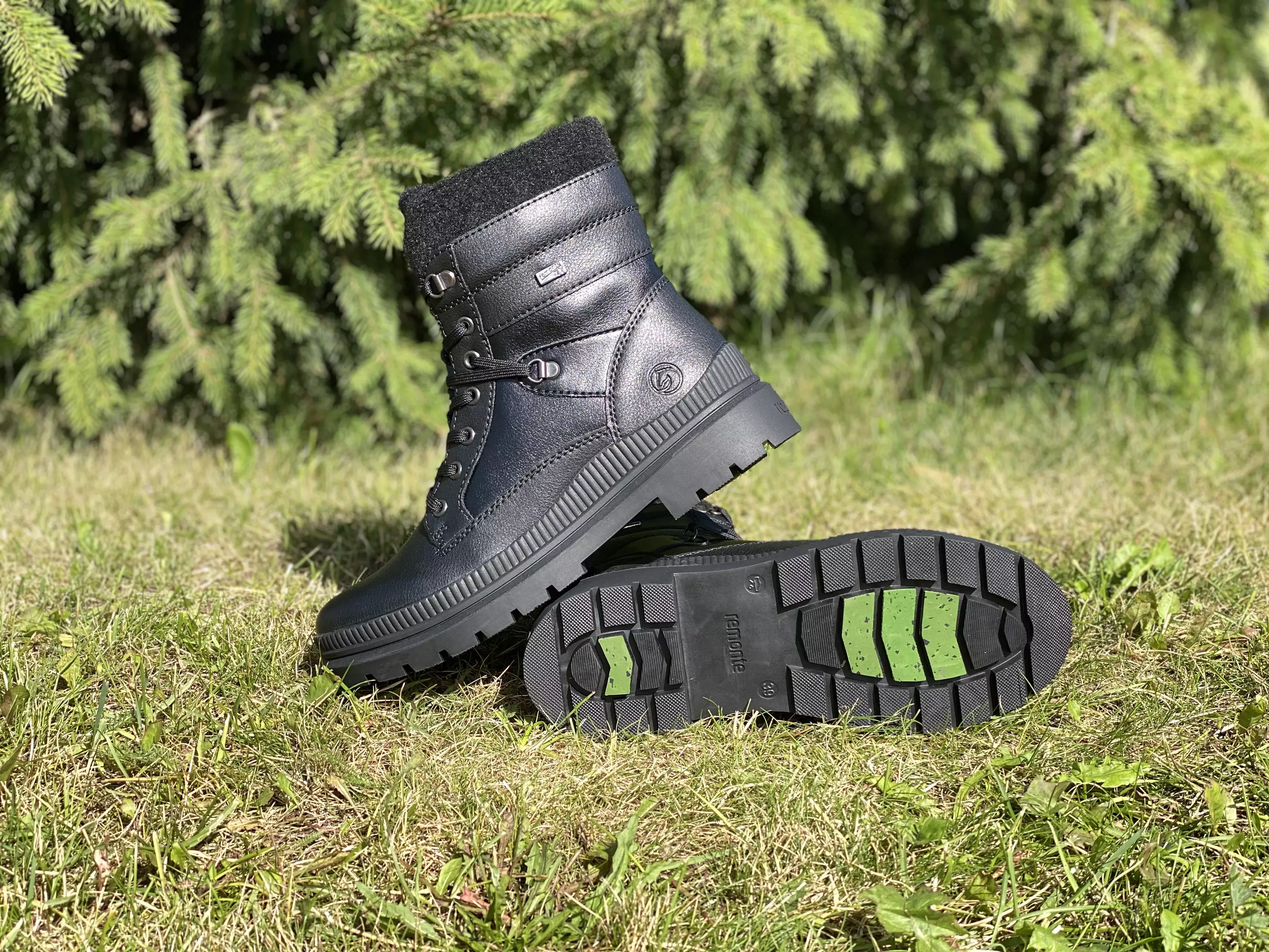 Mustat Remonte talvinilkkurit. RemonteTEX kalvo pitää kosteuden kengänt ulkopuolella. Nahkainen pinta ja pörröinen sisävuori (villaa). Nauhoilla kenkä säätyy sujuvasti omaan jalkaan sopivaksi ja sisäsyrjän vetoketju helpottaa pukemista. Varren yläreunassa huopaosio. Pinnan leikkaukset tuovat kenkään runsaasti ilmettä. Pörröpintainen irrotettava thermo-pohjallinen, jonka tilalle sujahtaa tarpeen vaatiessa omaan jalkaasi parhaiten istuvat pohjalliset. Pohjassa extra pitoa tarjoavat alueet,