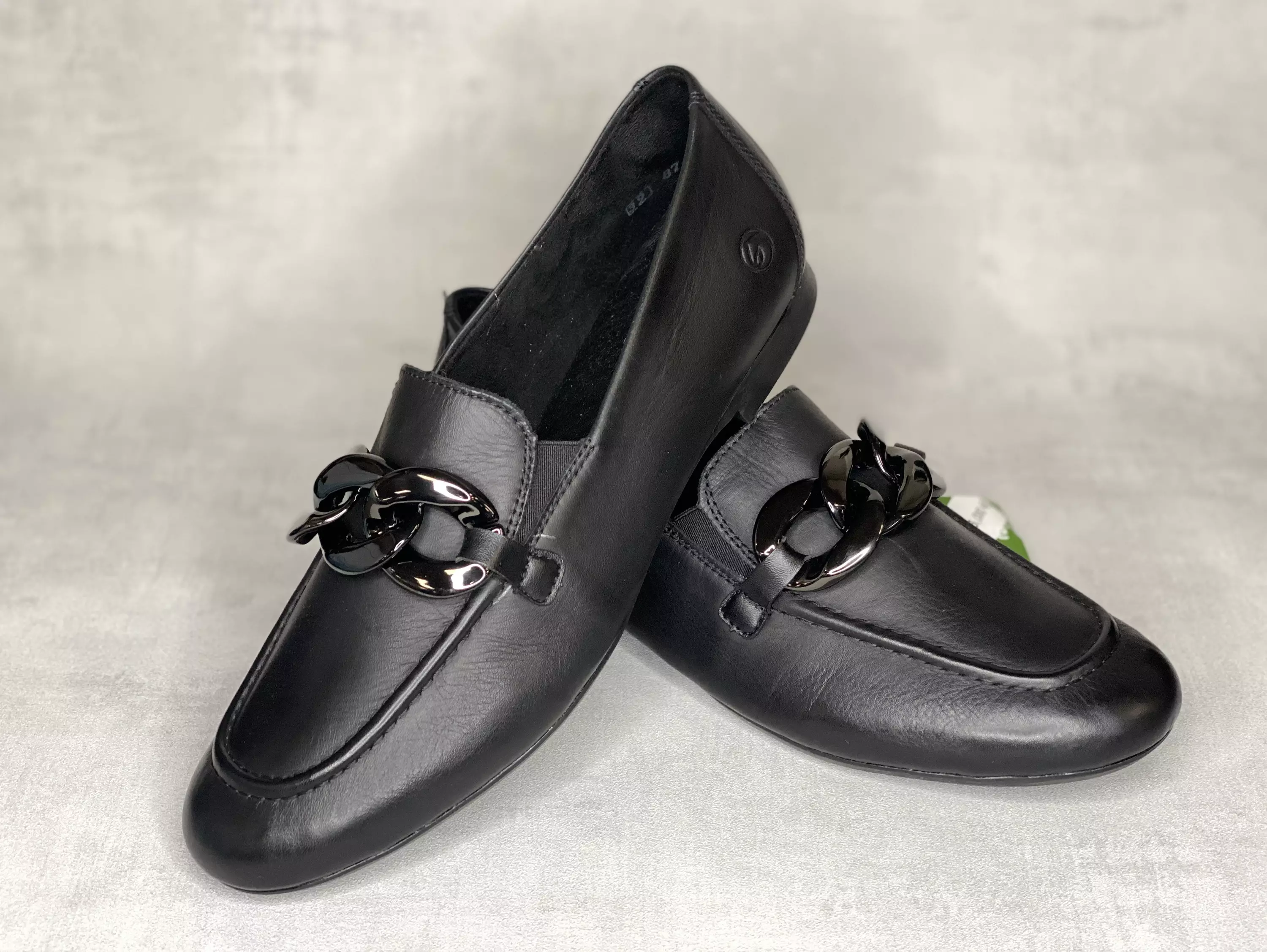 Mustat Remonte loaferit näyttävällä ketjukoristeella. Matala kanta ja tyylikäs kapeneva kärki.