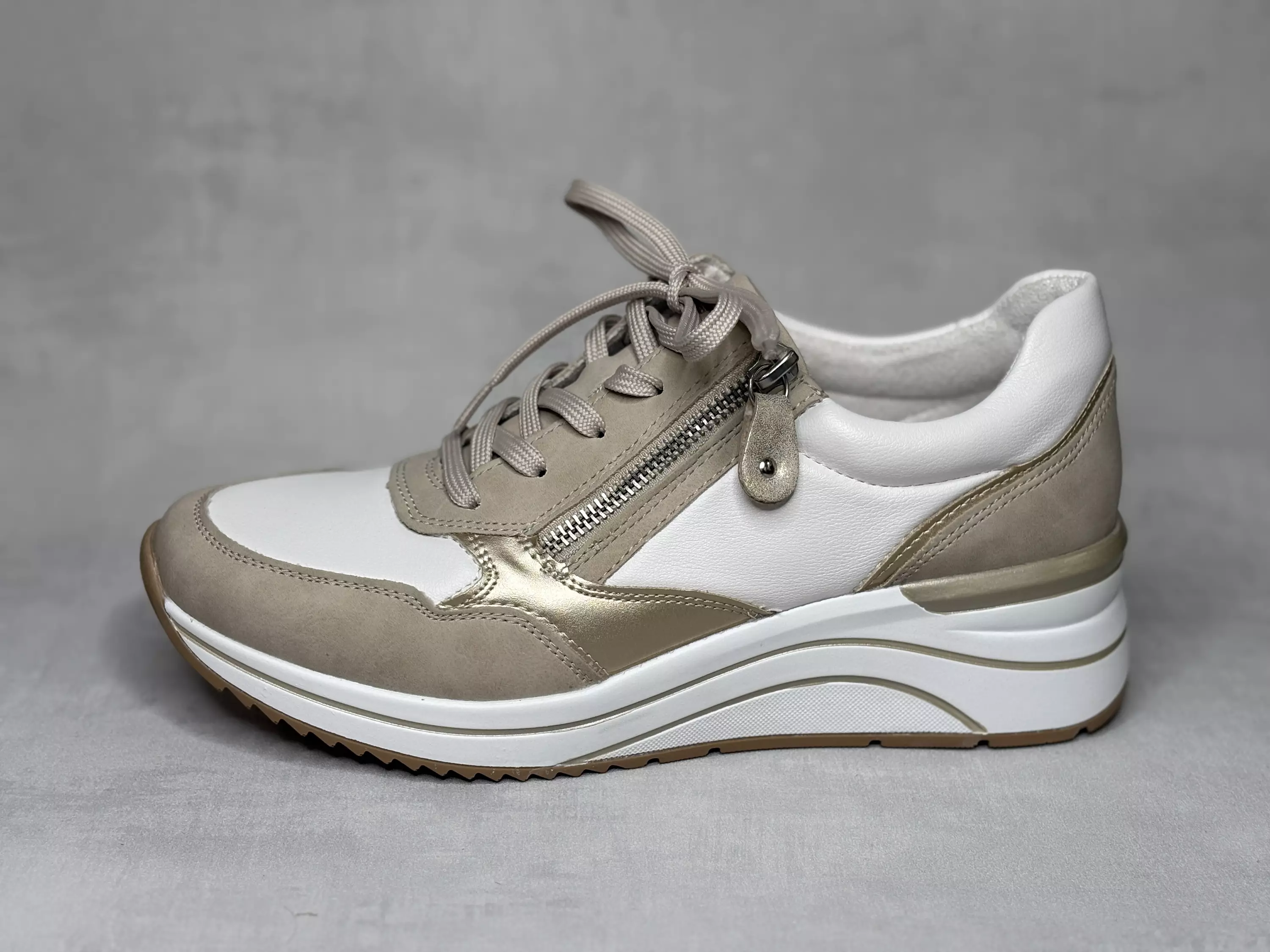 Valko-beiget Remonte kävelykengät. Kiilapohjaiset H-lestiset kävelykengät on varustettu nauhoilla, joten kengät on helppo säätää omaan jalkaan sopiviksi. Ulkosyrjälle sijoitettu vetoketju vauhdittaa pukemista. Pehmeät Remonte Soft-pohjalliset ovat vaihdettavat, joten tarvittaessa sujautat kenkiin omia tarpeitasi parhaiten vastaavat pohjalliset. Kannan korkeus noin 5cm ja pohjan korkeus päkiän alta noin 1,5cm.