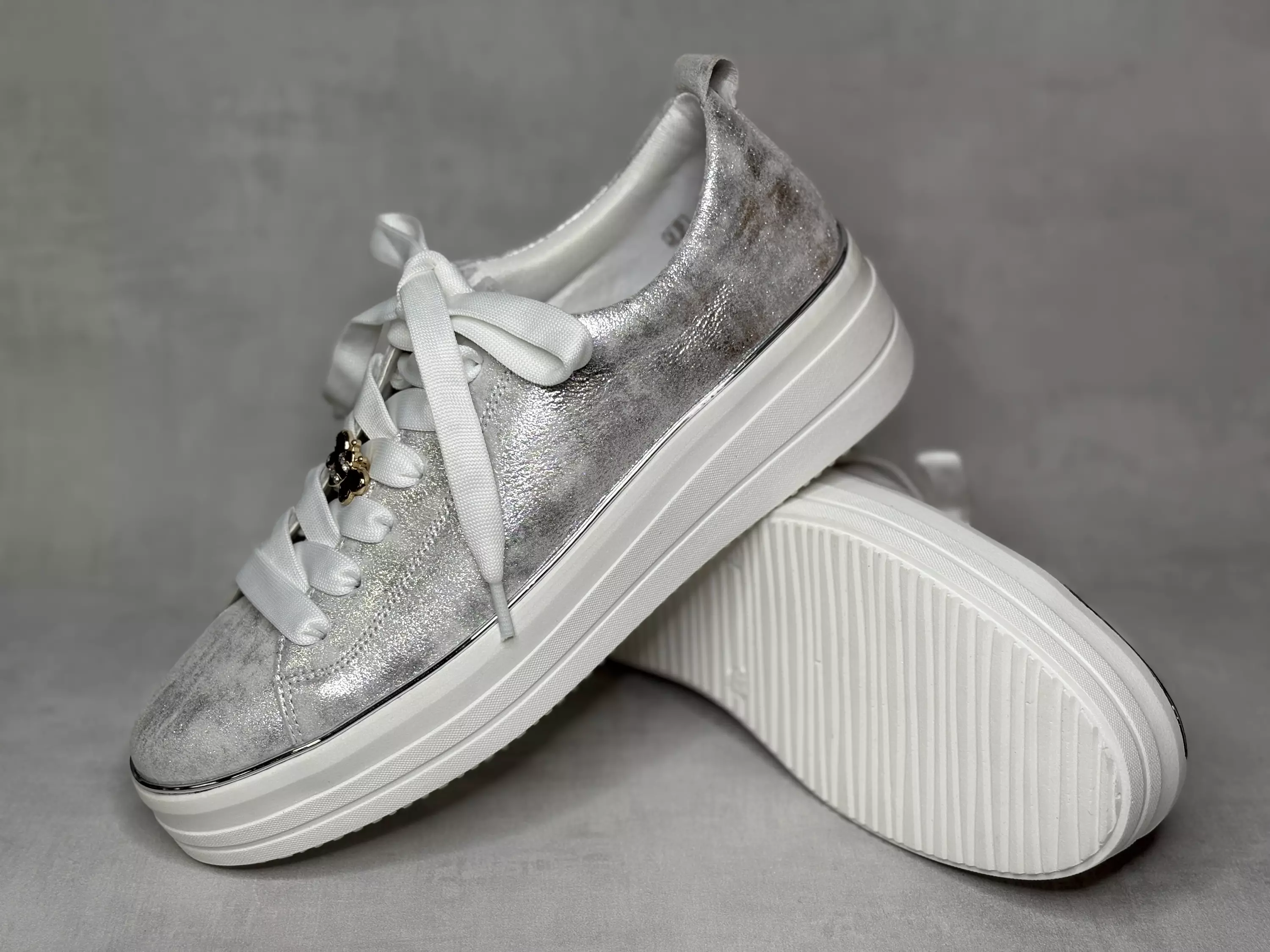 Hopeiset Remonte kävelykengät. Paksupohjaiset tennarityyppiset kävelykengät. Nauhoituksessa sievä metallinen mehiläinen, jonka voit halutessasi uudelleensijoitella nauhoituksen joukkoon. Pehmeät Remonte Soft pohjalliset, joiden tilalle vaihdat tarvittaessa omaan jalkaasi parhaiten sopivat pohjalliset. Kannan korkeus noin 4,5cm ja pohjan korkeus päkiän alta noin 2,5cm.