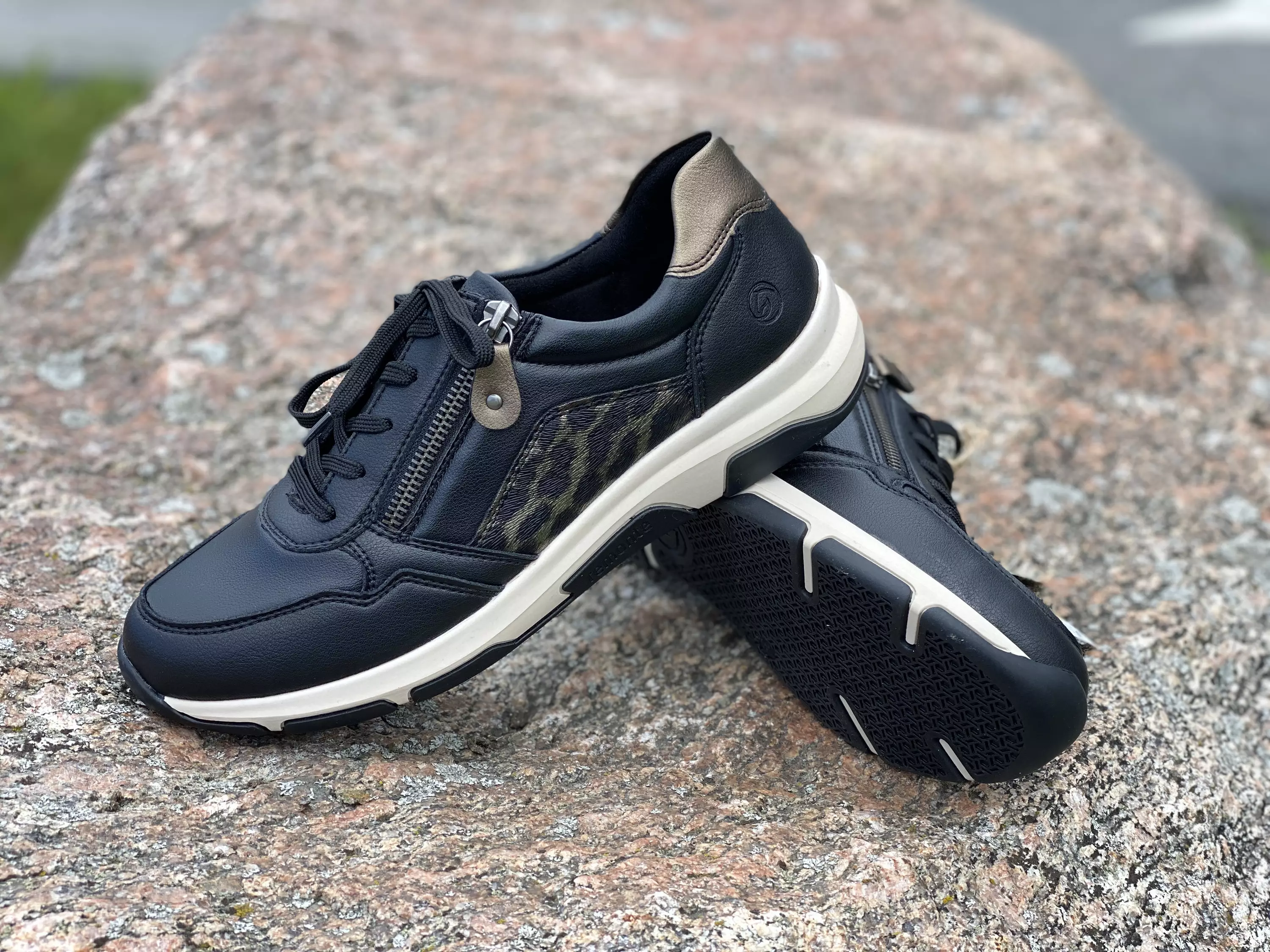 Mustat Remonte kävelykengät. Ulkosyrjällä pieni leopardikuosinen yksityiskohta. kävelykenkien ulkosyrjälle on sijoitettu pukemista helpottava vetoketju, joka toimii näissä kengissä myös yksityiskohtana. Nauhojen avulla kengät on helppo kiristää omaan jalkaan sopiviksi. Kantakappaleessa ja vetoketjun vetimessä kevyesti metallinhohtoiset yksityiskohdat. Muotoillut Remonte soft pohjalliset ovat vaihdettavat, joten tarpeen vaatiessa vaihdat näihin kävelykenkiin omia tarpeitasi parhaiten vastaavat pohjalliset.