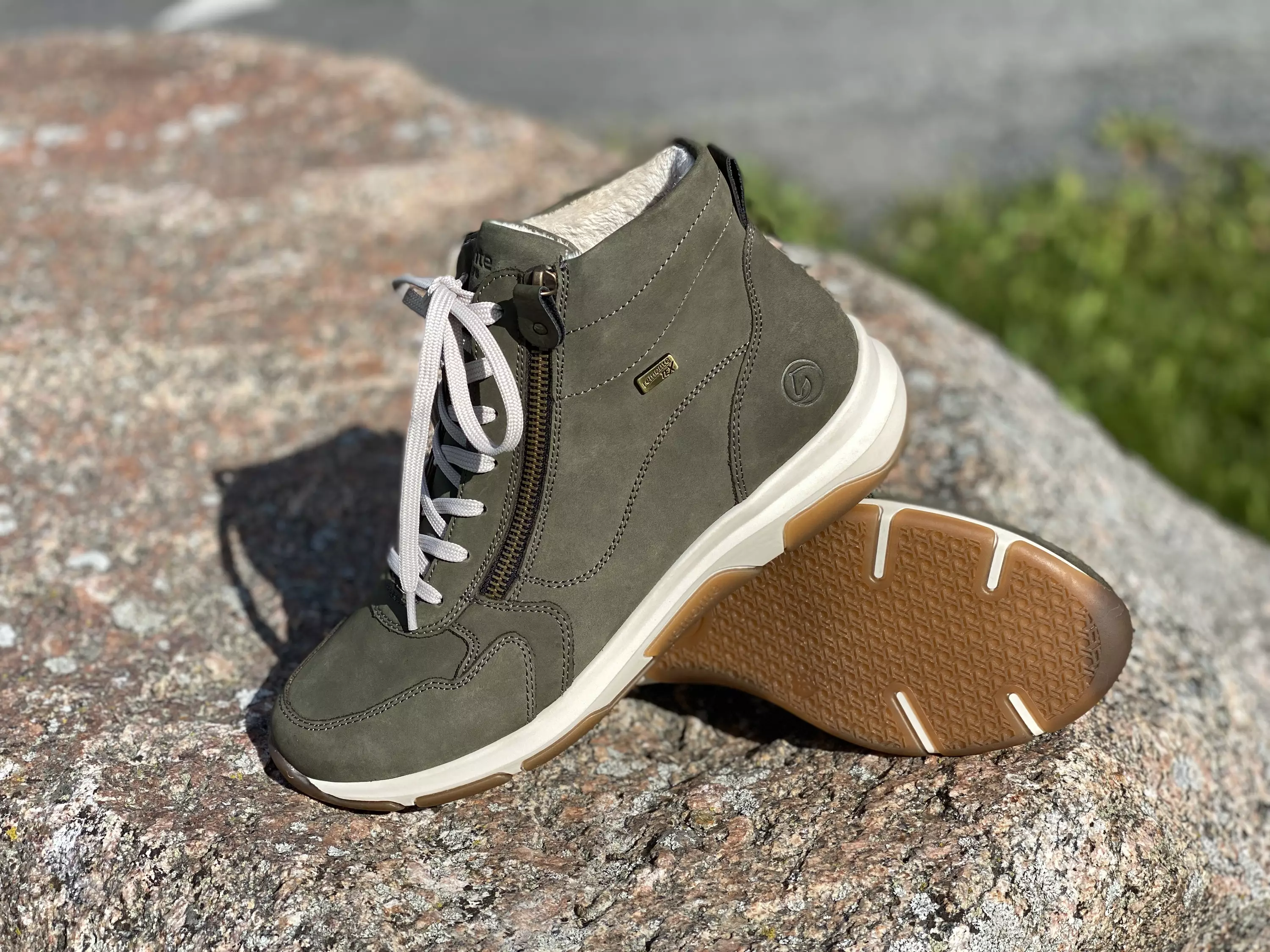 Vihreät Remonte kävelykengät. Korkeavartiset nauhalliset kävelykengät, joissa on ulkosyrjälle sijoitettu pukemista helpottava vetoketju, joka toimii myös kengän yksityiskohtana. Muotoillut Remonte Soft pohjalliset ovat vaihdettavat, joten tarvittaessa vaihdat kenkiin omia tarpeitasi parhaiten vastaavat pohjalliset.