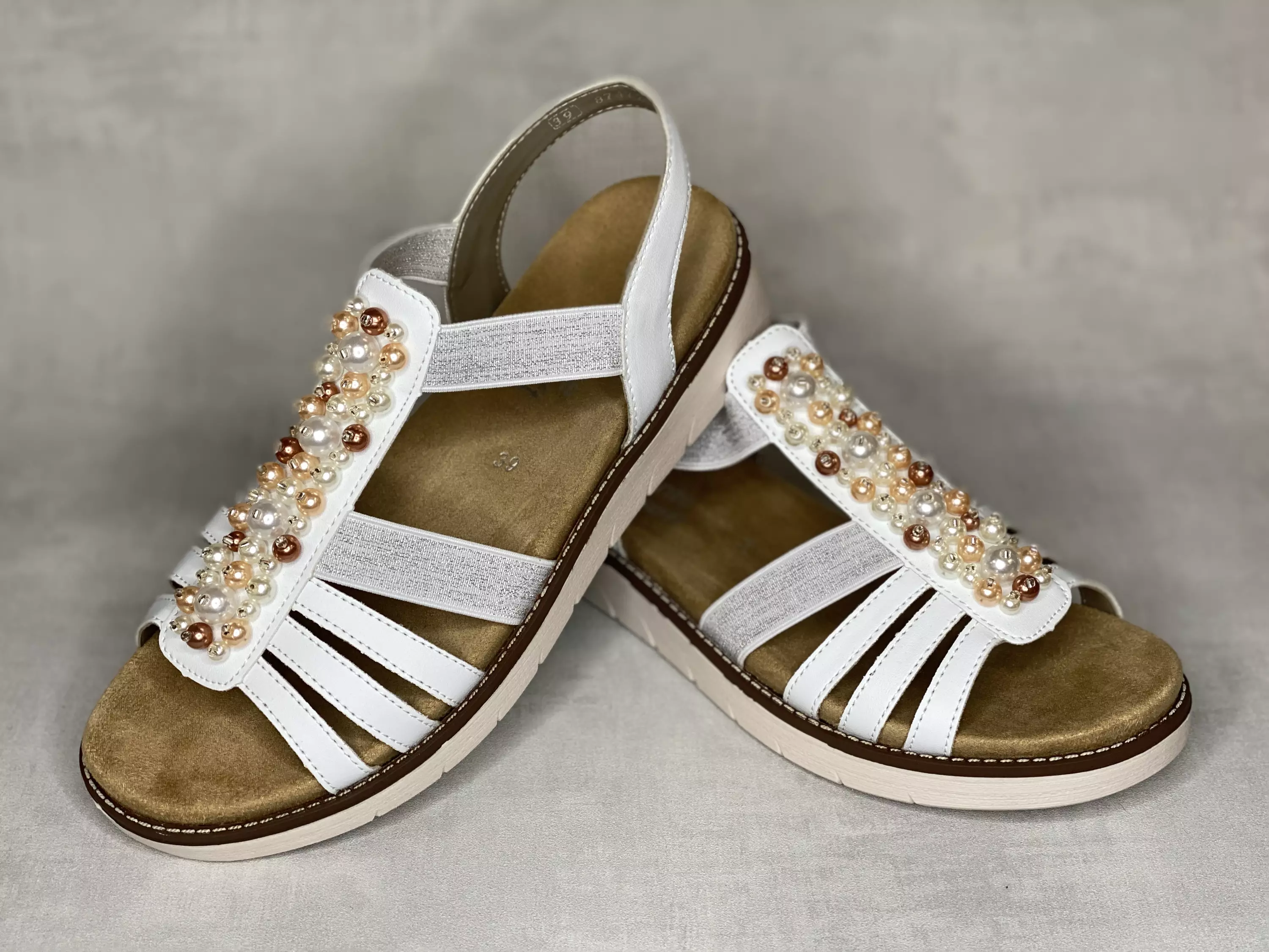 Valkoiset Remonte sandaalit. Koristeena valkoisia, vaaleanpunaisia ja vaaleanruskeita helmiä, joiden huippuna pieni kirkas helmi. Muistuttaa hämmästyttävän paljon vaaleita viinimarjoja! Kaksi ylintä remmiä ovat kevyesti hopeisenkimaltavia venykeremmejä, kantaosan remmi sekä kärkiosan kolme remmiä eivät jousta. Pehmeä Remonte Soft sisäpohja.