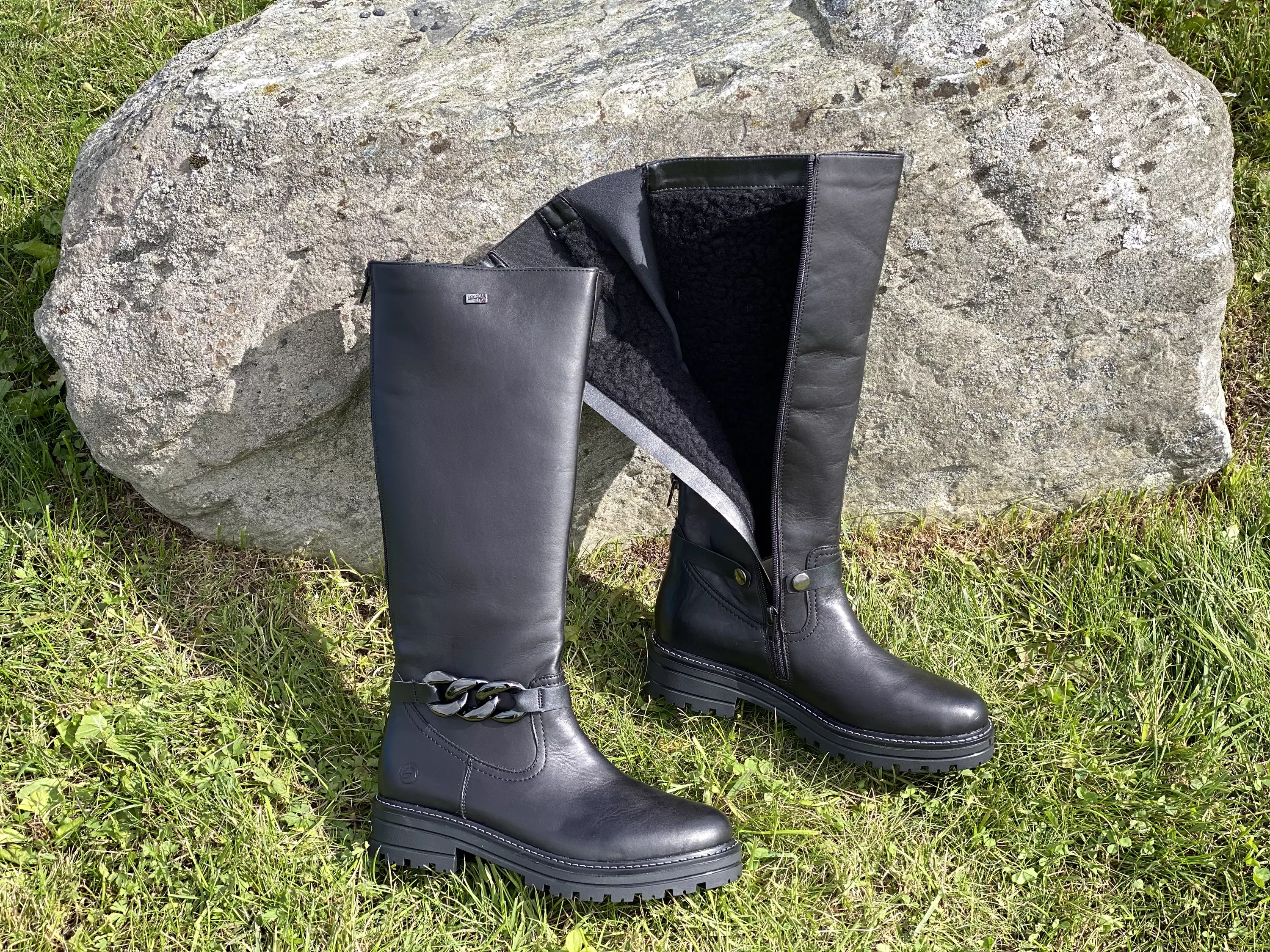 Mustat villavuoriset Remonte talvisaappaat. Nilkan ympärillä neppareilla kiinnitetty koristeremmi, jossa kolmilenkkinen ketju. Pörröisellä vuorilla varustetut nahkasaappaat ovat loistava valinta talven kylmyyksiin. Villavuorin lisäksi saappaissa on myös RemonteTex kalvo, joka auttaa pitämään varpaat kuivina ja kosteuden saappaiden ulkopuolella. Varren takaosassa vetoketju, jonka avulla saappaiden varteen voi vapauttaa muutamia senttejä lisää tilaa. Vaihdettavat pörröpintaiset pohjalliset, joten tarvittaessa vaihdat kenkiin omia tarpeitasi parhaiten vastaavat pohjalliset. Lisälämpöä kenkiin saat esimerkiksi Pedag Viva Winter talvipohjallisilla.