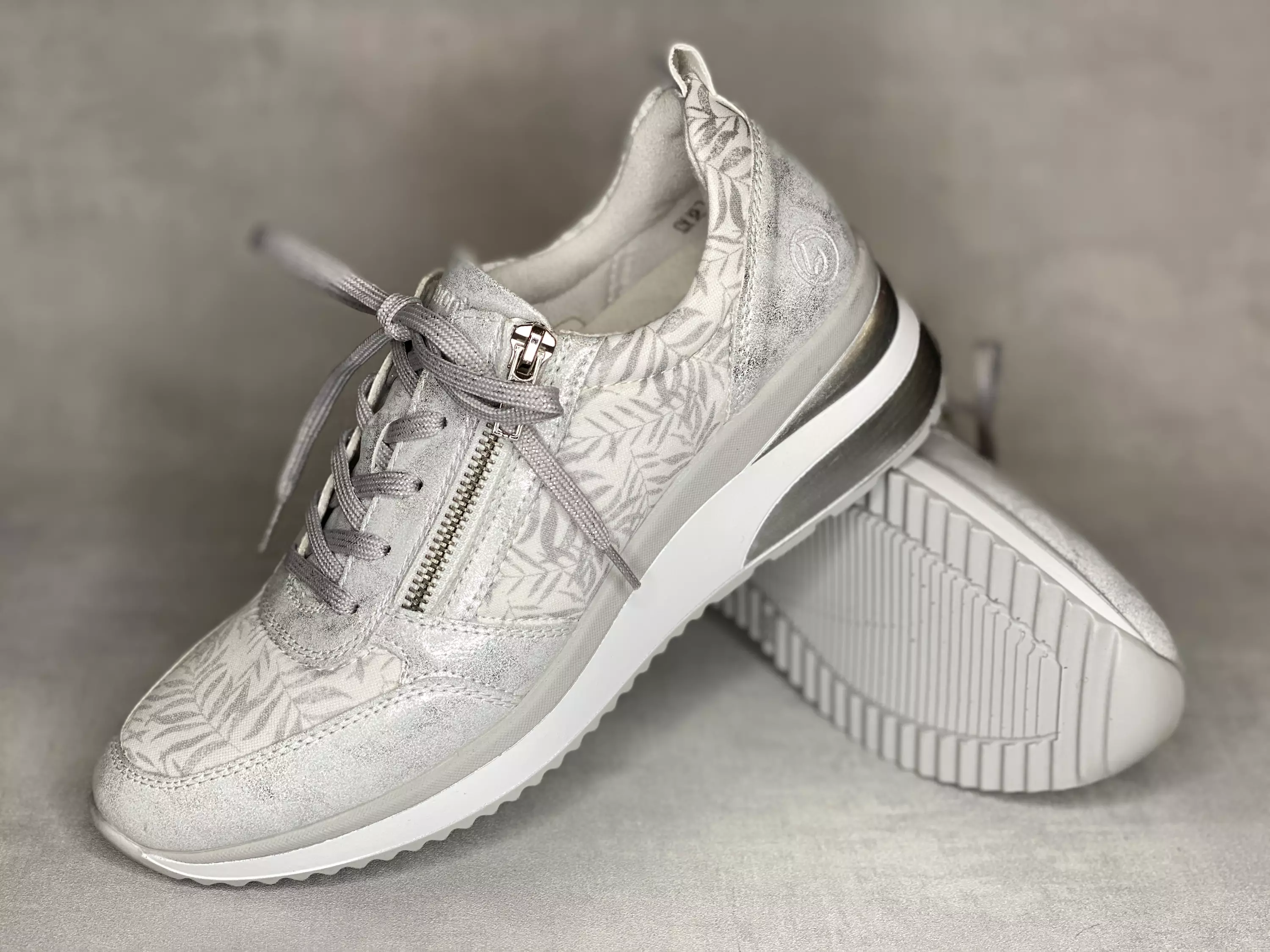 Hopea-valkoiset lehtikuvioiset Remonte kävelykengät. Matalat kiilapohjaiset citylenkkarit. Kenkä säätyy jalkaan sopivaksi nauhoituksen avulla. Ulkosyrjällä on pukemista helpottava ja yksityiskohtana toimiva vetoketju. Muotoiltu Remonte Soft pohjallinen, jonka tilalle sujautat tarpeen vaatiessa omaan jalkaasi parhaiten sopivat pohjalliset. Joustavat tekstiiliset sivut. Kannassa hopean värinen yksityiskohta.