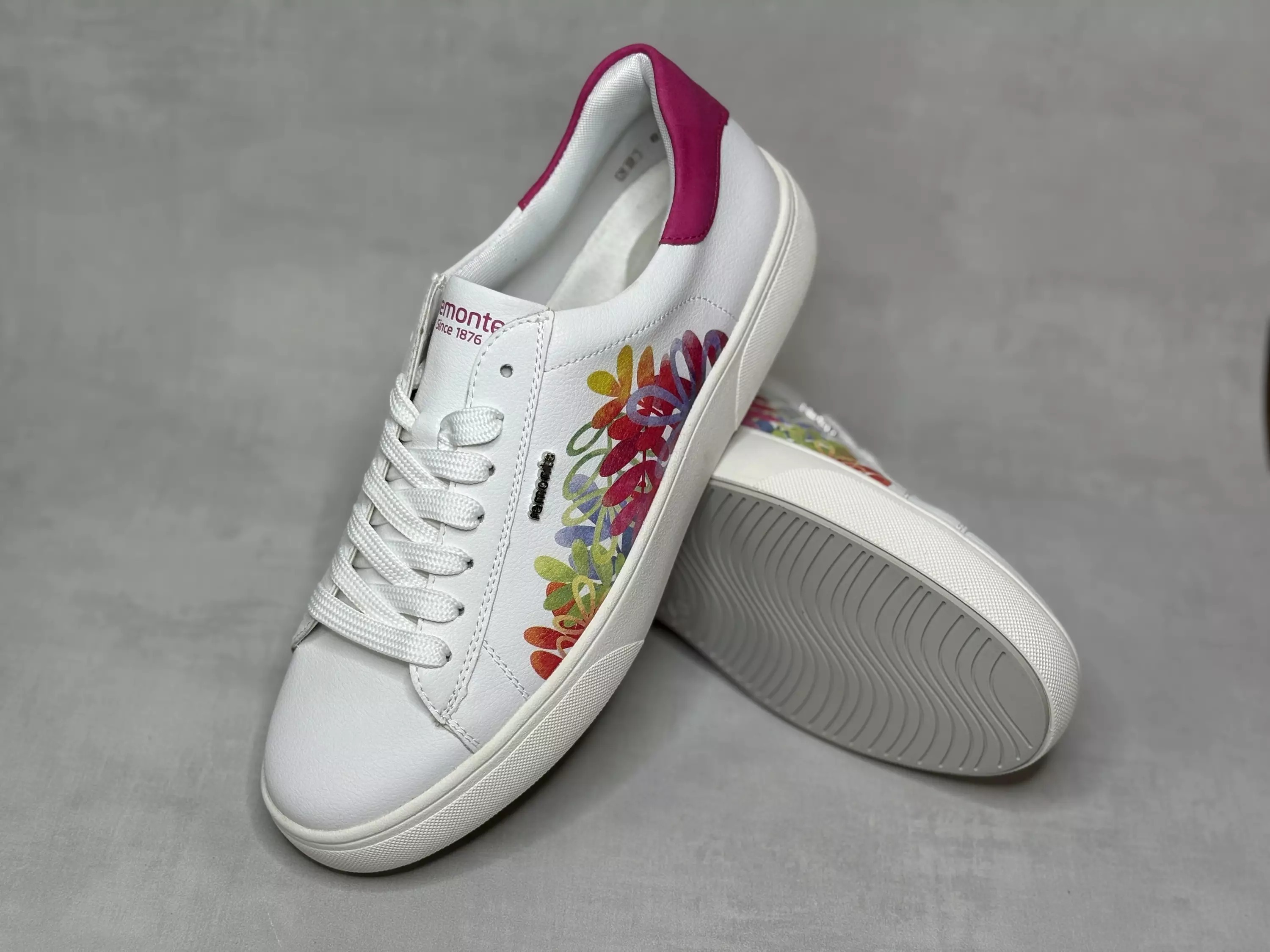 Valkoiset Remonte tennarit. Tennareiden ulkosyrjällä on monivärinen lehtikuvio. Kirkkaan pinkki kantakappale. Ulkoyrjällä metallinen Remonte-logo. Vaihdettavat pohjalliset, joiden tilalle sujautat tarvittaessa omaan jalkaasi parhaiten sopivat pohjalliset. Halutessasi saat tennareihin reippaasti lisäilmettä vaihtamalla niihin värilliset kengännauhat. Myös satiininauhat toimivat mainosti! Kannan korkeus noin 3cm ja pohjan korkeus päkiän alta noin 2cm.