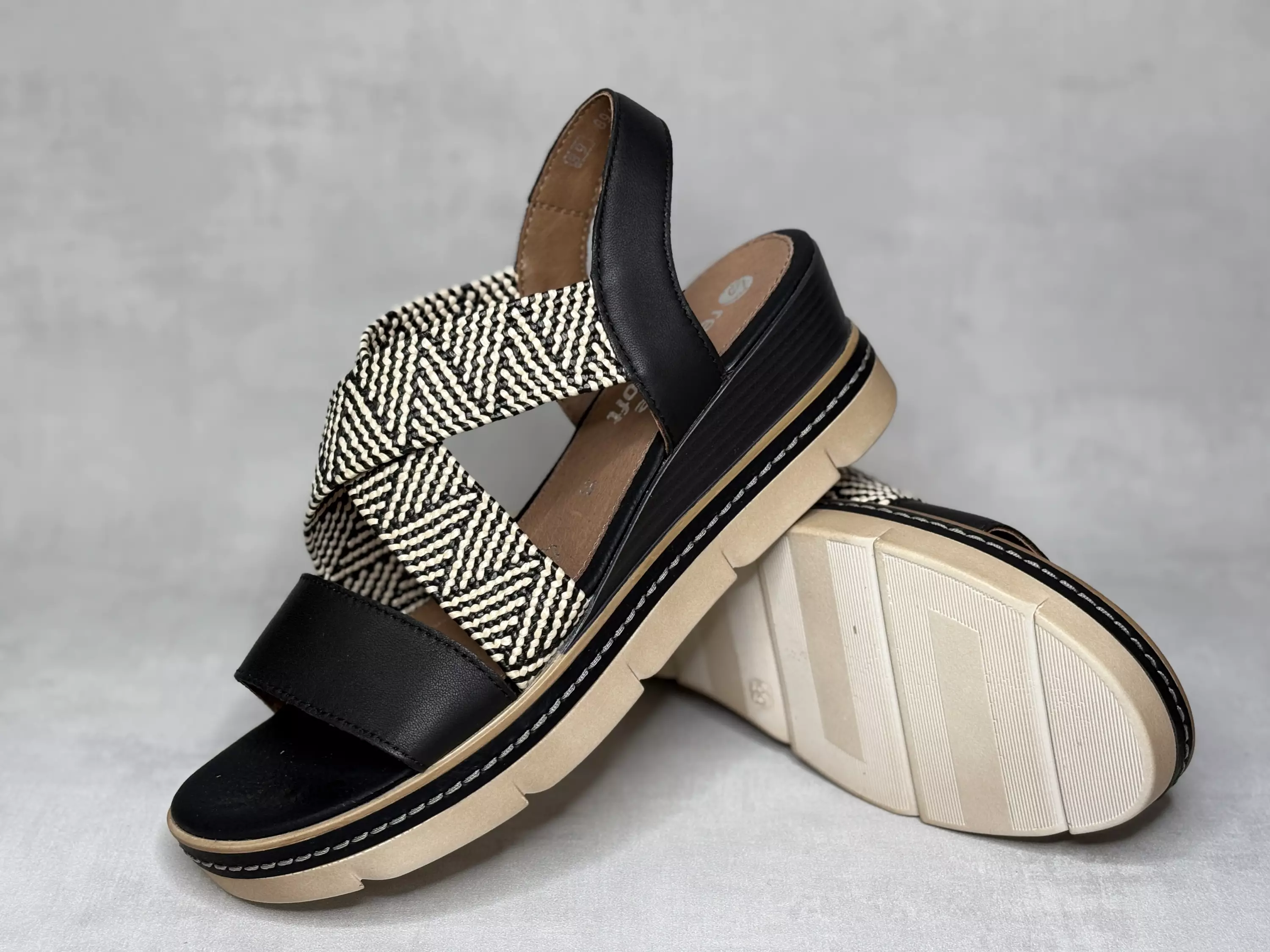 Mustat Remonta sandaalit. Nämä kiilapohjaiset sandaalit on varustettu joustavilla ristikkäin menevillä punosremmeillä. Punosremmien kuviointi antaa kengille reilusti ilmettä. Vaalea ulkopohja. Kiilapohjan sivuissa mustaa raitaa tikkauksen kera, että tumma hieman puuta muistuttava pohjan yläreuna. Kannan korkeus noin 6m ja pohjan korkeus päkiän alta noin 2,5cm.