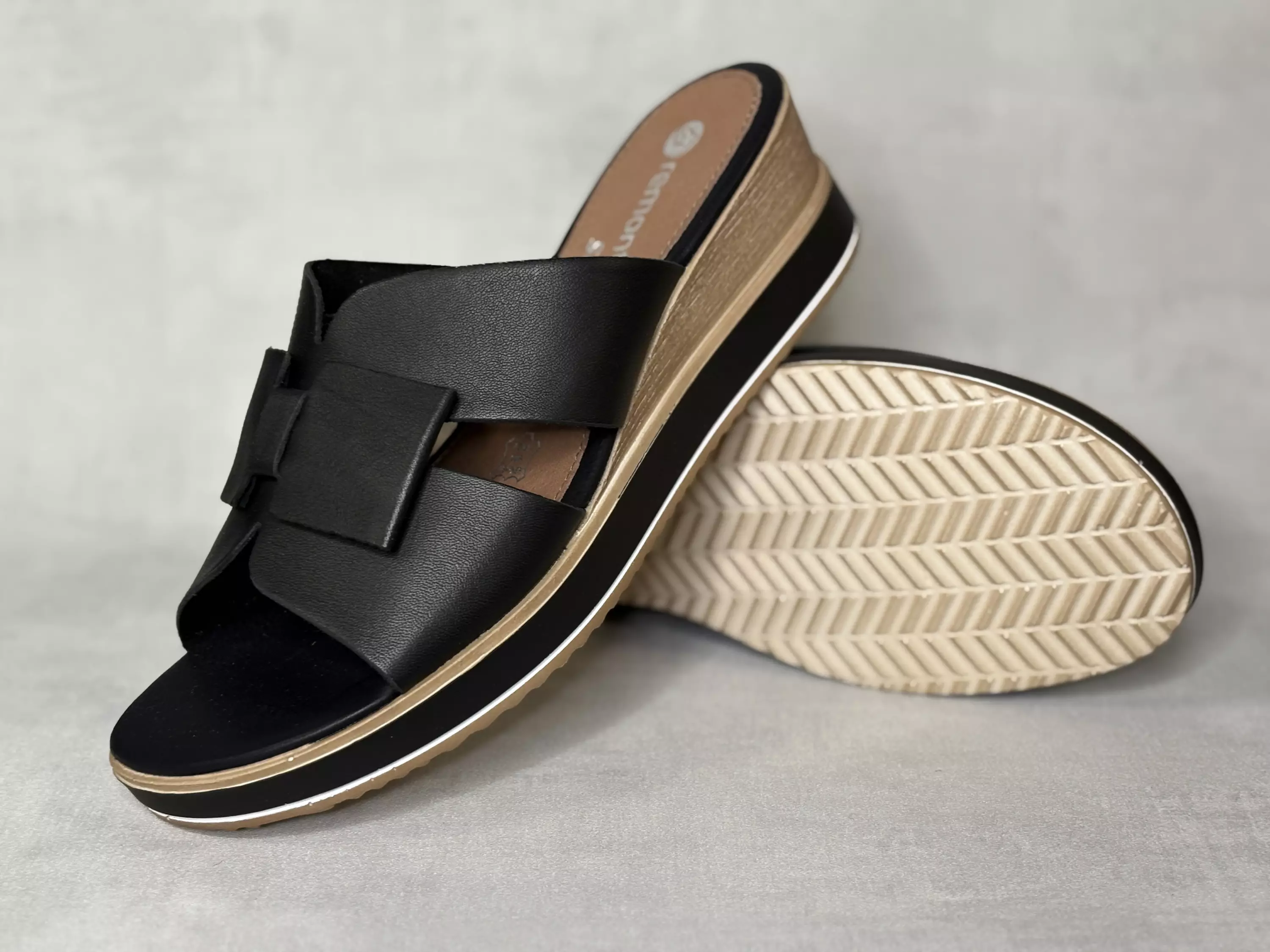 Mustat Remonte sandaalit. Kiilapohjaiset nahkasandaalit rusettikoristeella. Ylemmän remmin sisäsyrjällä sandaaleiden istuvuutta parantava venyke. Kannan korkeus noin 5cm ja pohjan korkeus päkiän alta noin 2cm.
