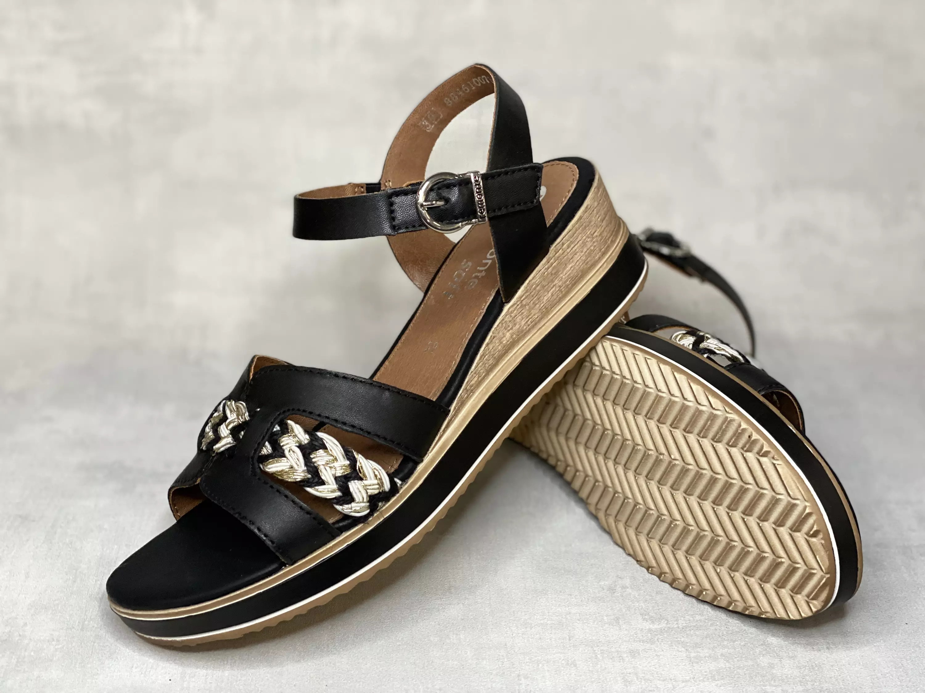 Mustat Remonte sandaalit. Kiilakorkoiset sandaalit on varustettu tarrasäätöisellä nilkkaremmillä, jossa on metallin värinen koristesikju. Kärjessä punoskoriste, jossa yhdistyvät musta, kulta ja valkoinen. Ulkopohjan mustassa ulkosivussa on kapea valkoinen raita ja kannan alle jäävä kiilaosuus muistuttaa puun pintaa.