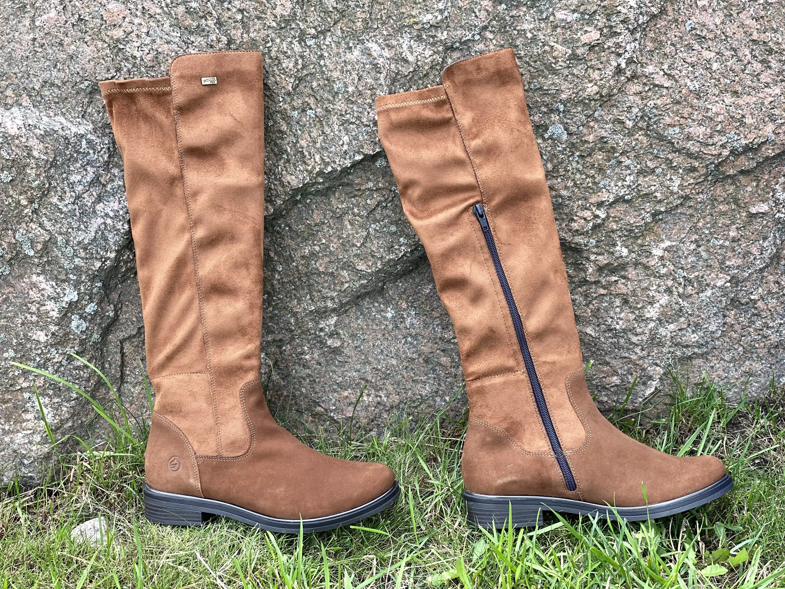 Ruskeat pitkävartiset Remonte saappaat. Pitkävartisten saappaiden takaosa on joustavaa tekstiiliä, jonka ansiosta saappaat sopivat mainiosti erikokoisiin pohkeisiin. Joustava tekstiiliosio on pinnaltaan vastaavan näköistä, kuin kenkien etu-ja kärkiosien mokkanahka. Varressa on sisäsyrjällä pukemista helpottava vetoketju. Huomaa, ettei vetoketju kulje koko varren mitalta, vaan varren yläreuna on umpinainen. Kengissä on kosteudelta suojaava RemonteTex kalvo.