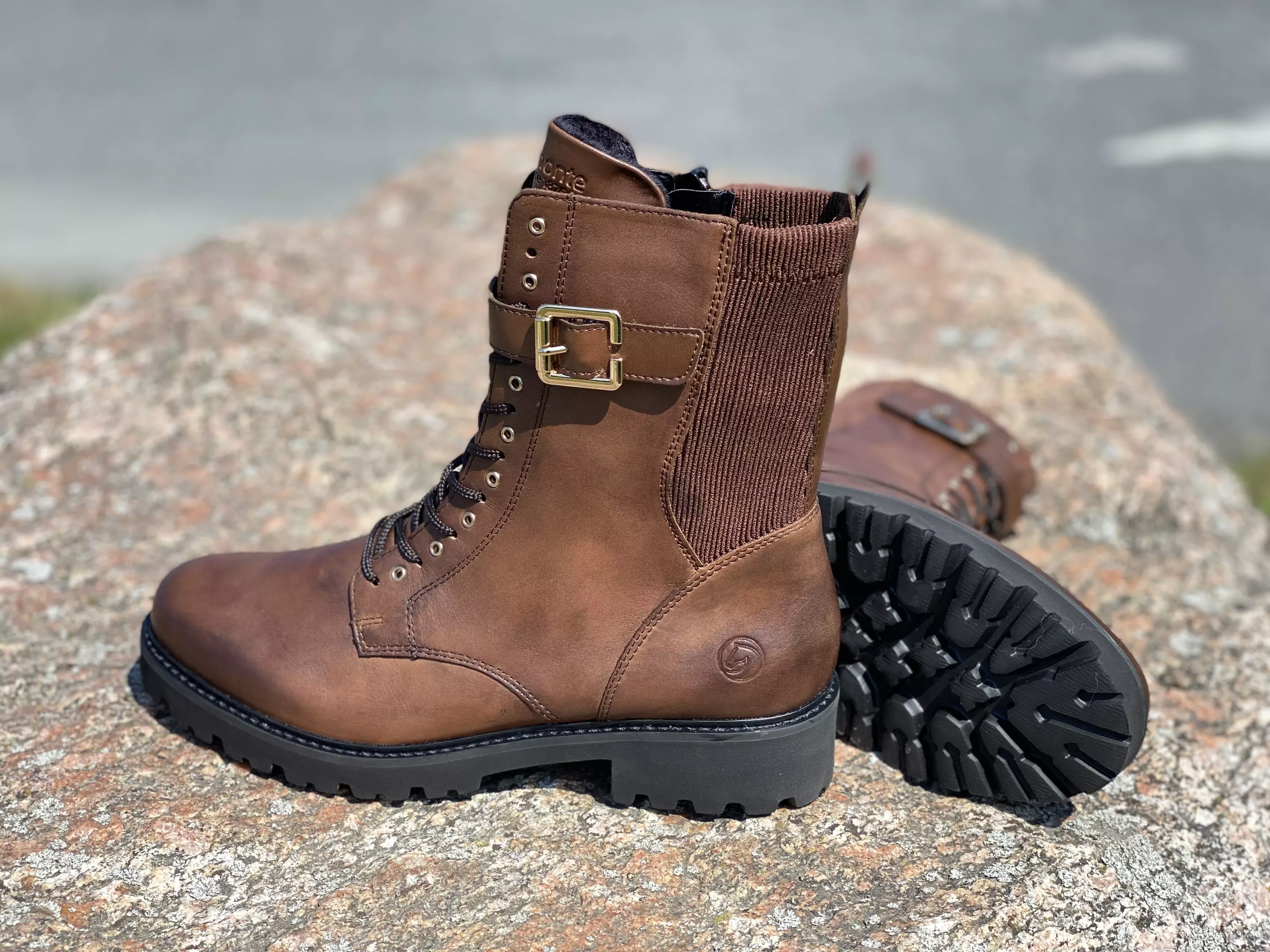 Tummanruskeat Remonte maiharit. Varsin klassiset maiharit, joiden sisäsyrjällä on vetoketju. Nauhojen avulla maiharit on helppo säätää omaan jalkaan sopivan kireälle. Veikeä tuplarei'itetty nauhakuja, joissa jokatoisessa reiässä on sirkkarengas. Tehdasnauhoitus kulkee sirkkarenkaattomien nauhakujien läpi. Varren yläreunassa koristesoljellinen remmi, joka säätyy sopivaksi tarran avulla. Varren takaosa on kevyesti joustavaa materiaalia, varren suun kohdalta materiaali joustaa vähemmän kuin varresta. Ohuet huopapintaiset pohjalliset ovat vaihdettavat, joten tarvittaessa sujautat kenkiin omia tarpeitasi parhaiten vastaavat pohjalliset.