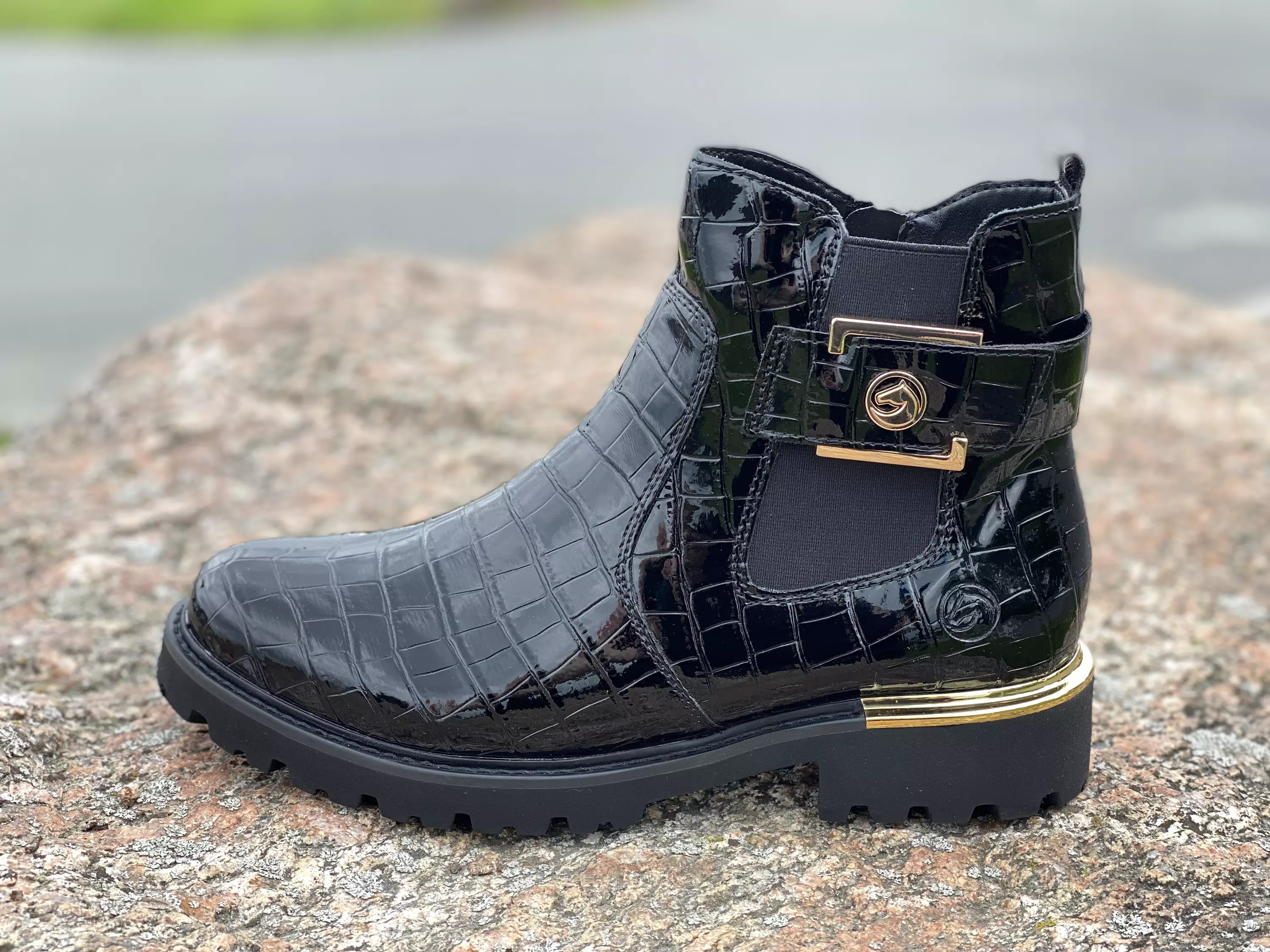 Mustat Remonte nilkkurti. Remonten krokokuosisessa nilkkurissa on näyttävä kullanvärinen koristesolki jonka keskellä komeilee Remonten hevosen pää logo. Kullanvärinen osio löytyy myös kengän kannasta. Tekstiilinen sisävuori on matalanukkaista fleeeceä ja mukava jalassa. Sisäsyrjällä on pukemista helpottava vetoketju, ulkosyrjällä koristesoljen alla puolestaan kengän istuvuutta parantava venyke. Kannan korkeus noin 3,5cm, edestä noin 2cm. Varren korkeus noin 13cm.
