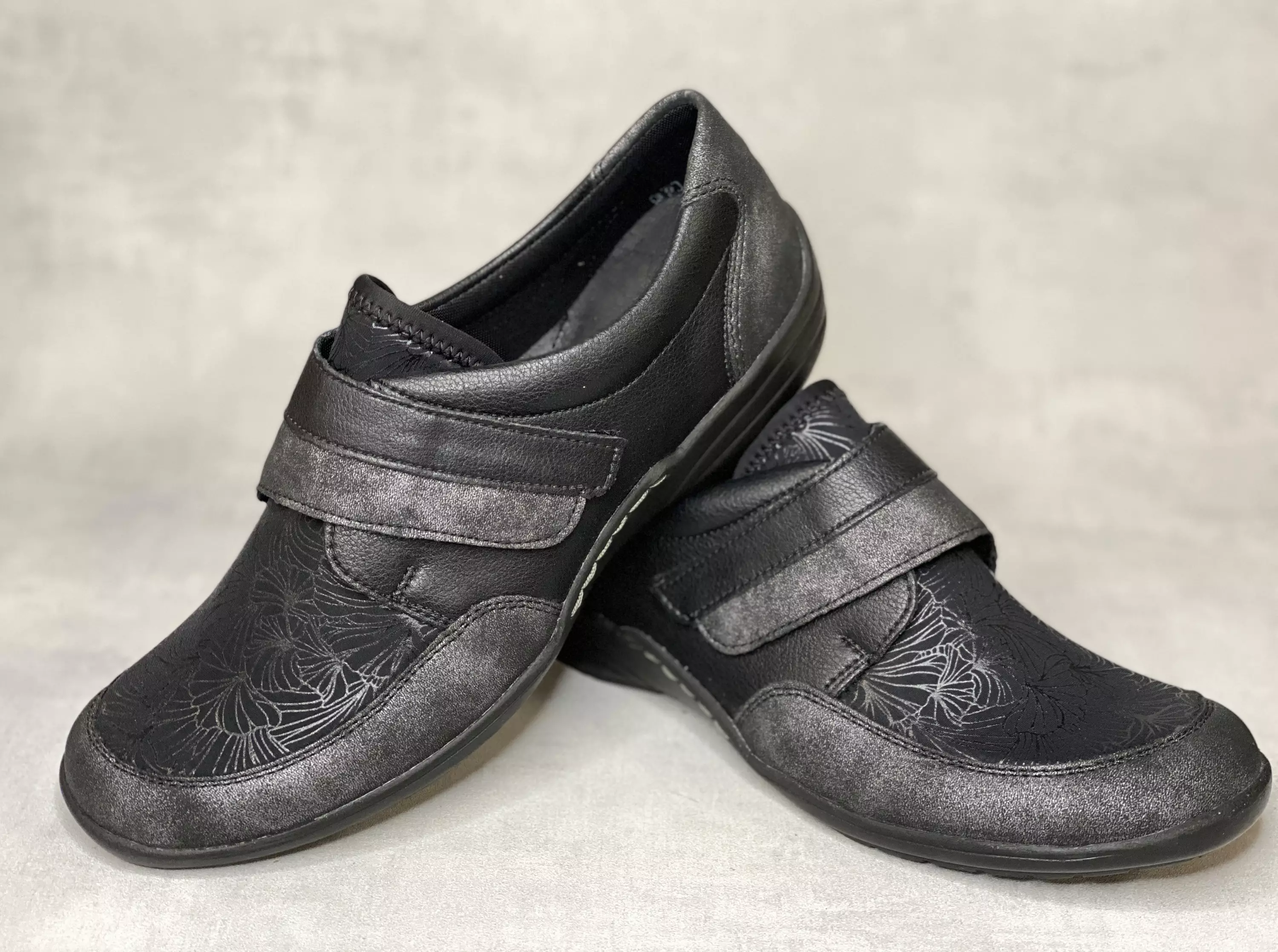 Mustat Remonte kävelykengät. Tarrallinen pääliremmi, jolla kenkien istuvuutta on helppo säätää omaan jalkaan. Tummanharmaaseen taittavat yksityiskohdat kengn kärjessä, remmissä ja kannassa. Nahkapintaiset pohjalliset ovat vaihdettavat, joten tarpeen vaatiessa sujautat kenkiin omiin jalkoihisi parhaiten sopivat pohjalliset. Vaivaisenluun kohdalla kengän pinta on joustava.
