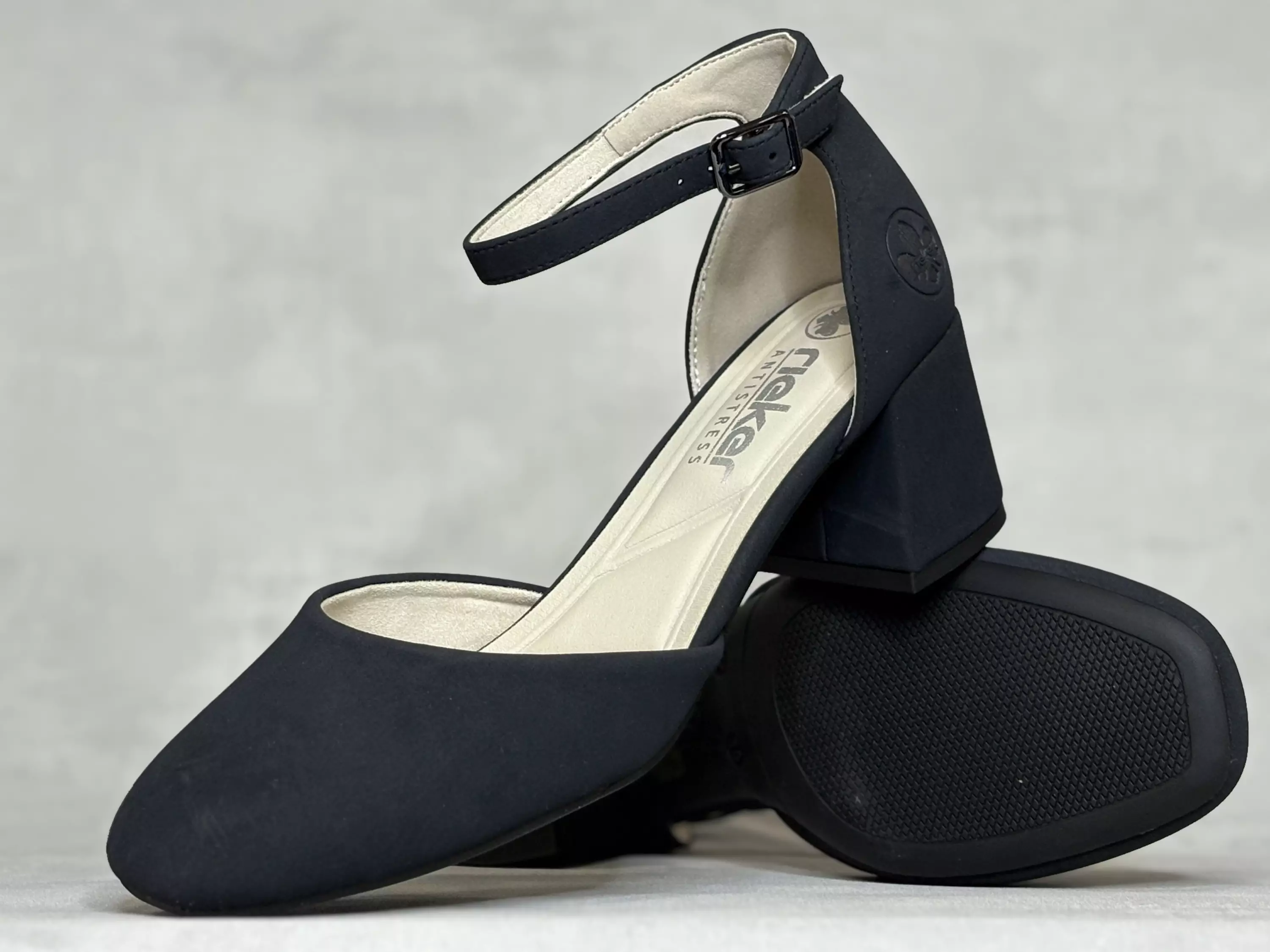 Tummansiniset Rieker korkokengät. Niin tummansiniset umpikärkiset korkokengät, että ovat lähestulkoon mustat. Mattapintainen väri. Solkisäätöinen nilkkaremmi pienellä venykkeellä. Tukeva paksu korko. Kannan korkeus noin 5,5cm ja pohjan korkeus päkiän alta noin 0,5cm. Lestimitoitus kapea F.