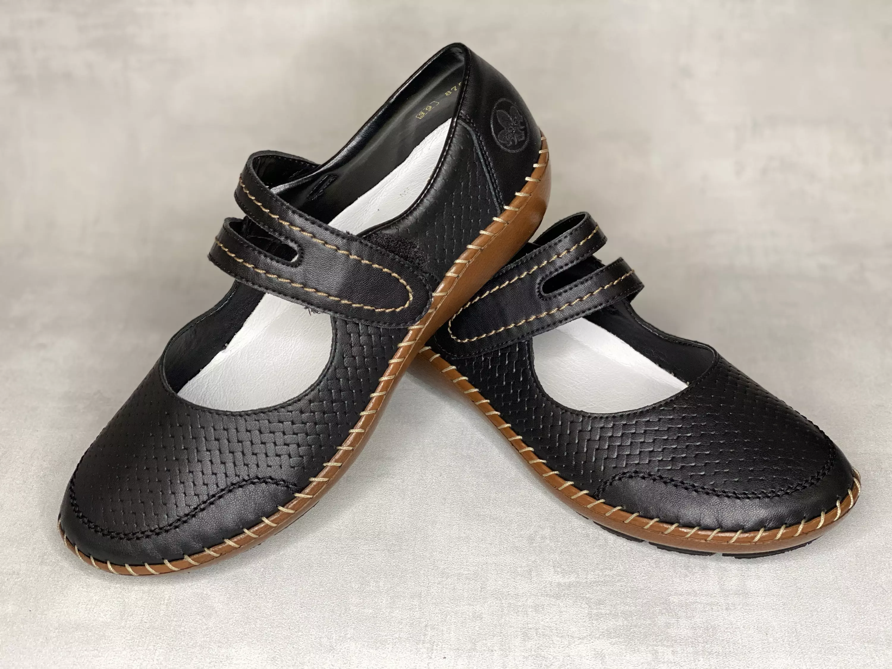 Mustat Rieker kävelykengät. Kävelykengä säätyvät jalkaan tarrallisen remmin avulla. Punoskuvioitu pinta. Tarraremmiin ilmettä tuovat vaaleanruskeat tikkaukset. Tumman konjakinruskea ulkopohjan sivu tuo kenkään kontrastia. Normaali lesti.