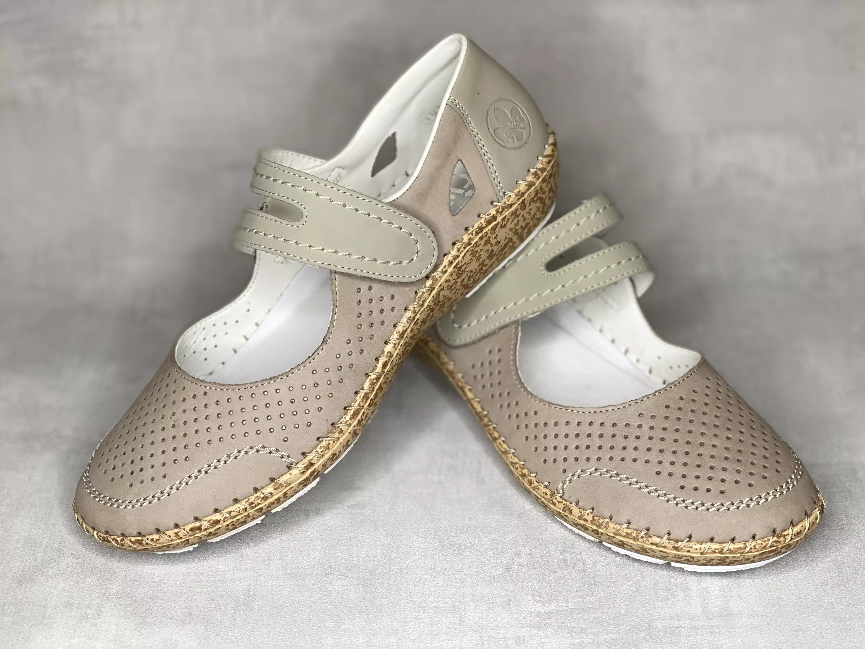 Beiget Rieker kävelykengät. Säädettävällä tarraremmillä varustetut kävelykengät, joissa reikäkuvioinen kärki. Nahkapintainen sisäpohja. Ulkopohjan sivussa korkkikuvioinen kaitale.