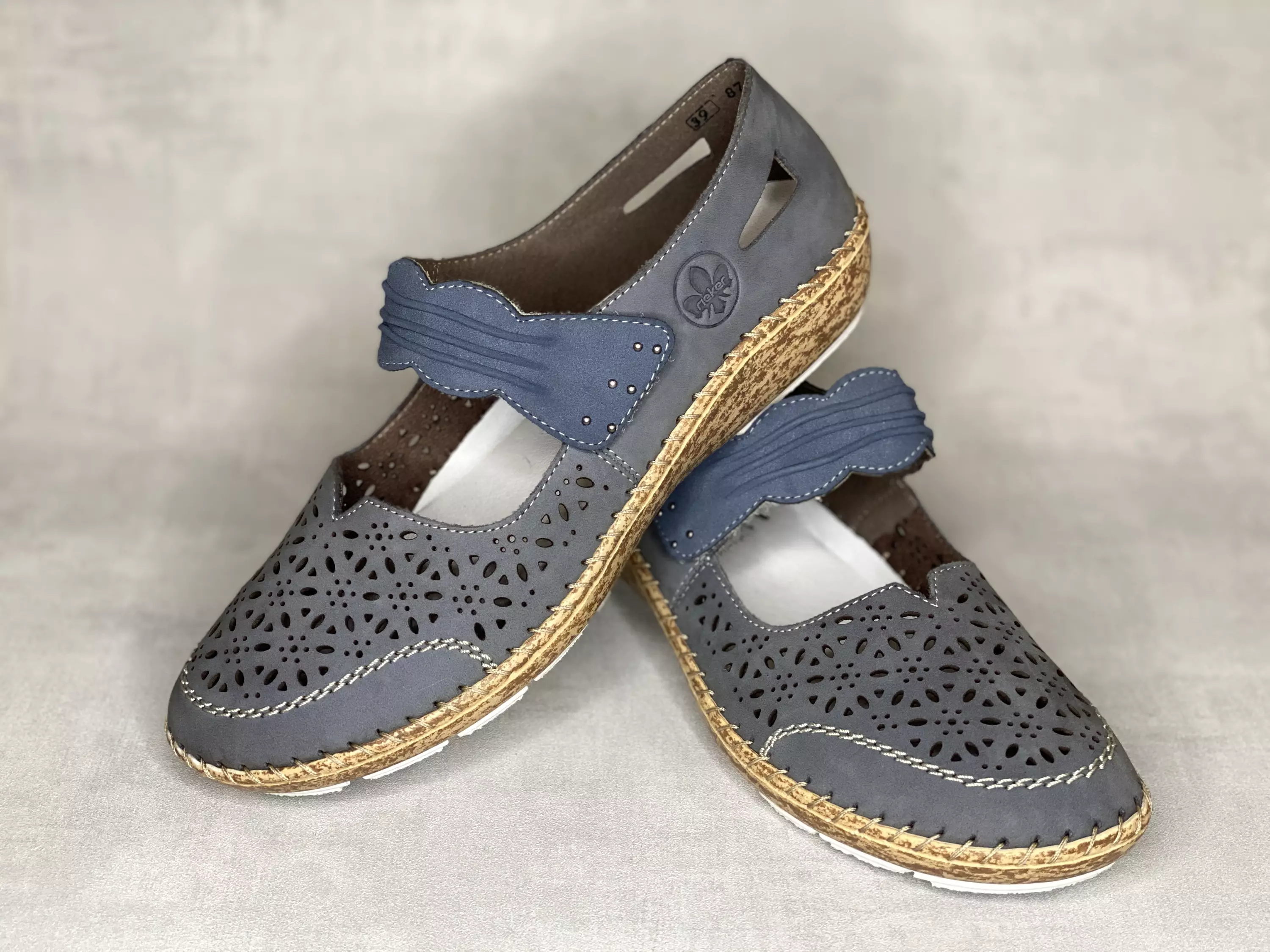 Siniset Rieker kävelykengät. Säädettävällä tarraremmillä varustetut kävelykengät, joissa reikäkuvioinen kärki. Nahkapintainen sisäpohja. Ulkopohjan sivussa korkkikuvioinen kaitale.