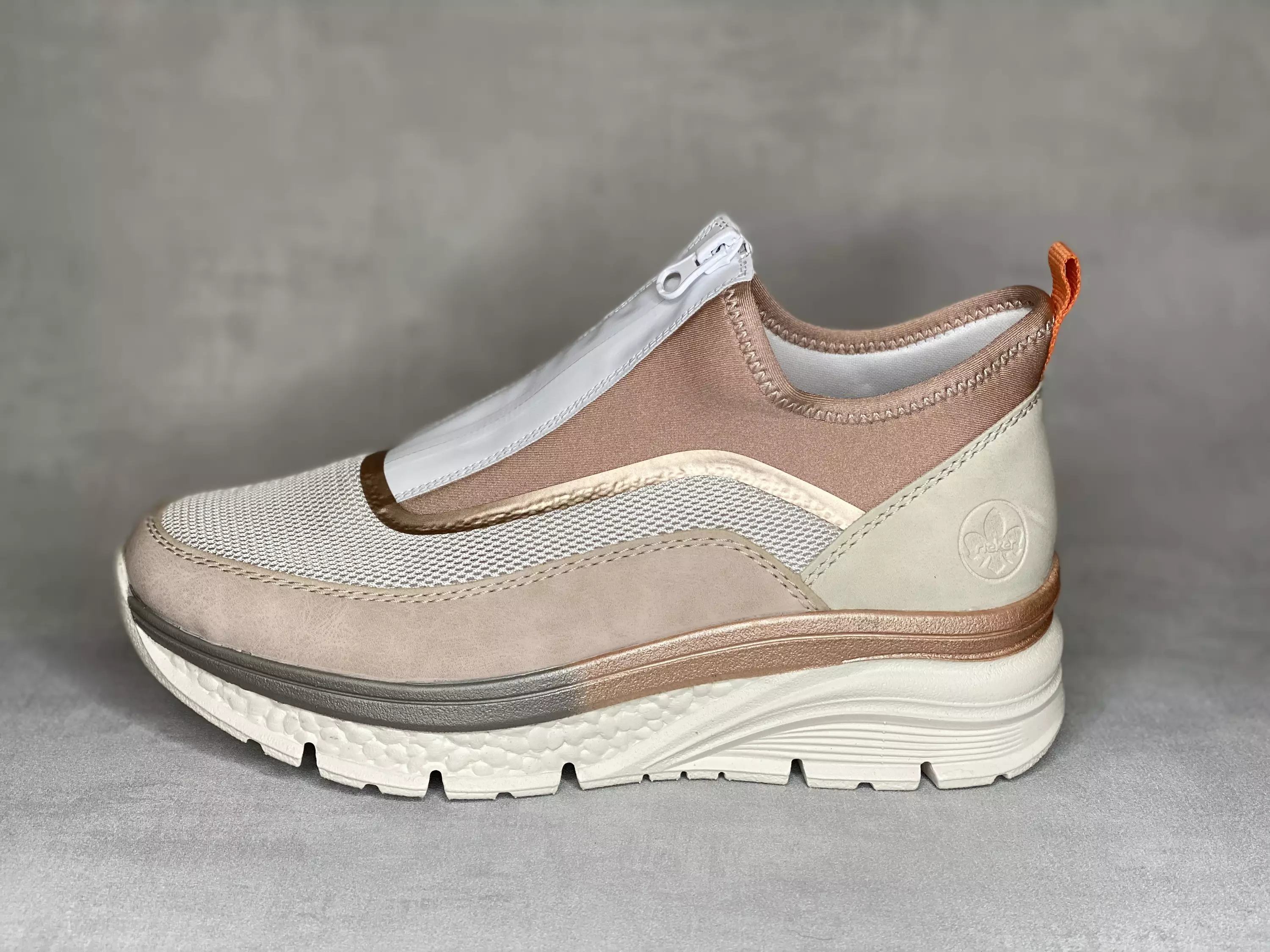 Vaaleanpunaiset/nudet kiilapohjaiset Rieker kävelykengät. Varren yläosa on joustavaa tekstiiliä ja kengän etuosaan sijoitettu vetoketju helpottaa pukemista. Ulkopohja on väriltään vaalean beige ja pohjan yläreuna on kaksivärinen.