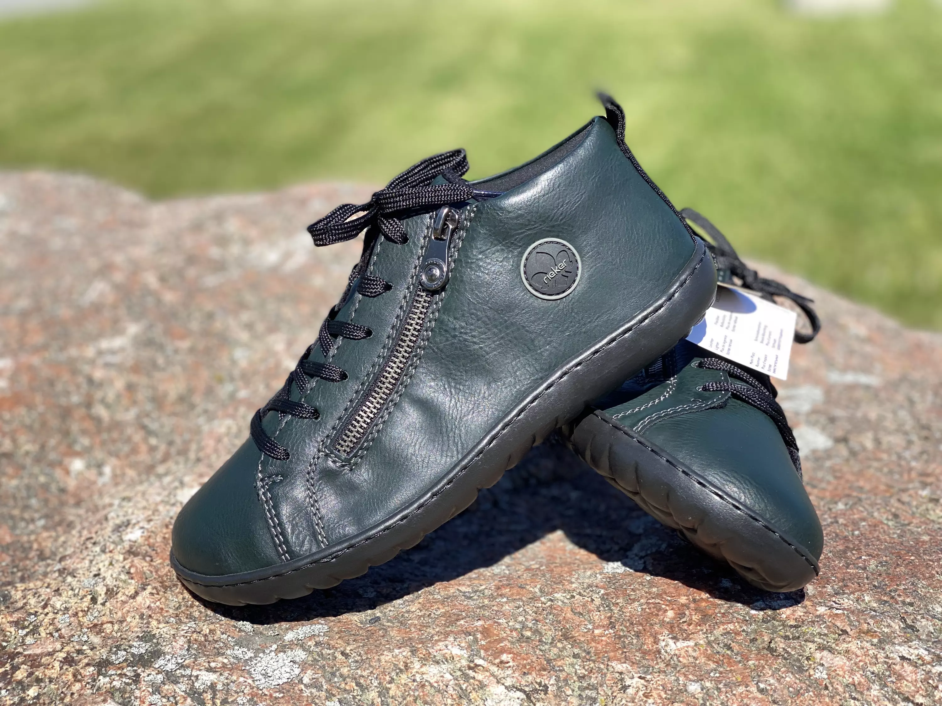 Tummanvihreät Rieker kävelykengät. Ulkosyrjälle sijoitetulla vetoketjulla sekä nauhoilla varustetut tennarit. Jalan mallinen kärki, jossa on varpaille hyvin tilaa. Käytännössä tämä on Riekerin versio paljasjalkakengästä. Kannassa tekstiilinen vetolenkki.