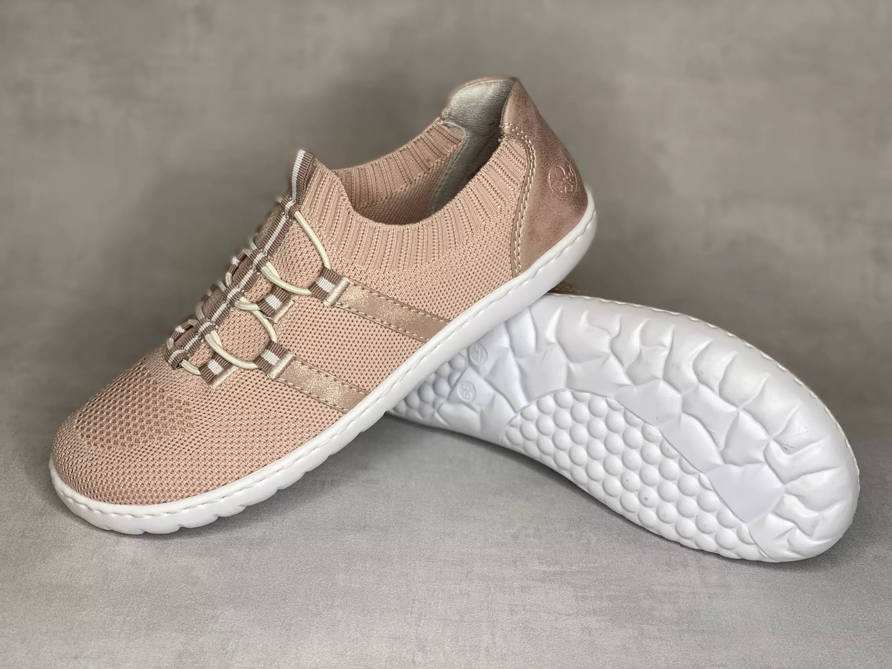 Vaaleanpunaiset Rieker kävelykengät. Todella kevyet tekstiiliset tennarit. Kiinteät valkoiset venykenauhat eivät ole säädettävissä. Nauhoituksen päällä kulkevassa yksityiskohdassa on kapea valkoinen. Korkkipintainen kiinteä sisäpohjallinen ja valkoinen ulkopohja. Pyöreässä kärjessä on varpaille hyvin tilaa. Kevyesti joustava tekstiilipinta.