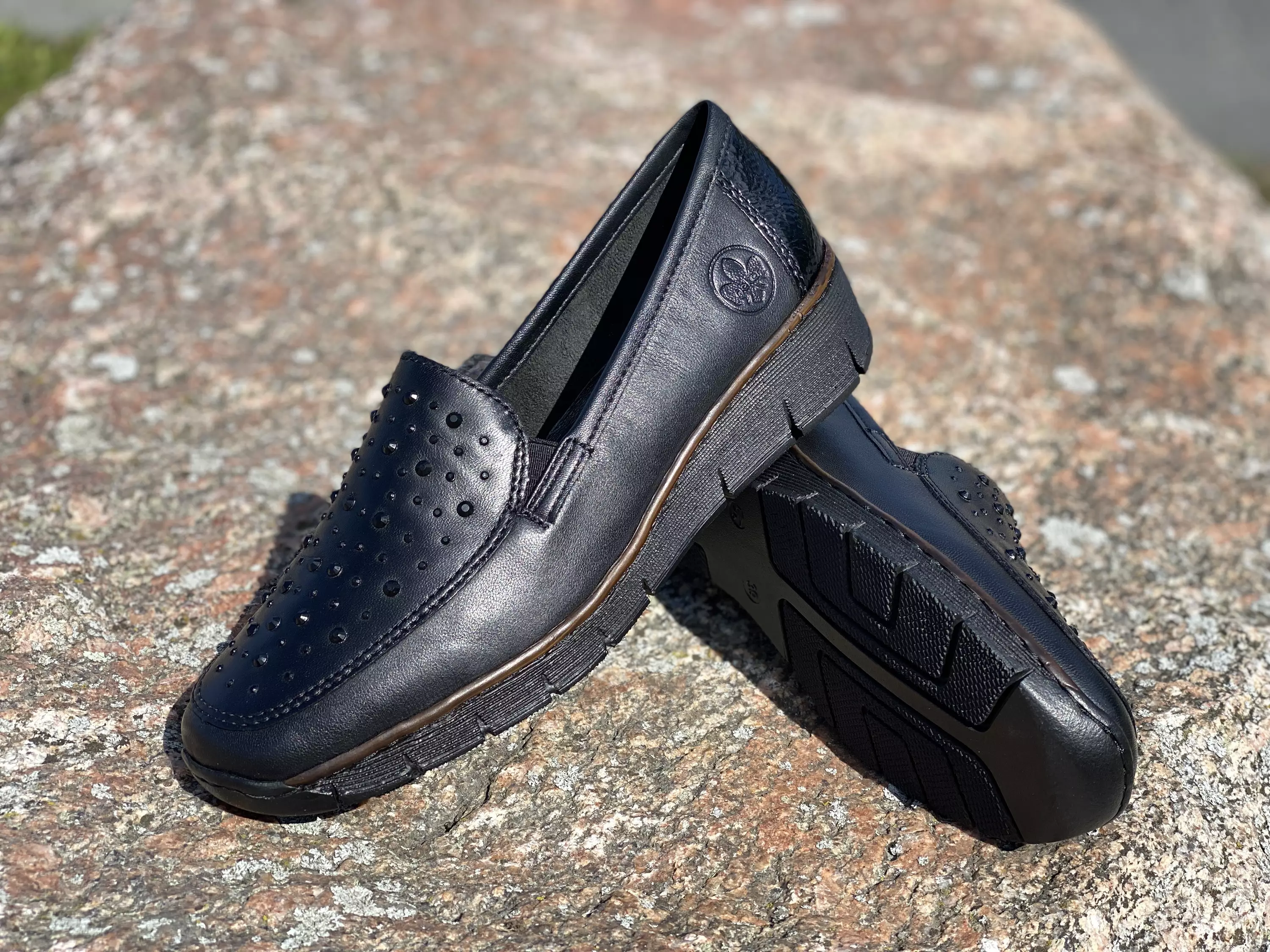 Mustat Rieker loaferit. Strassikoristeiset kävelykengät, joissa sisä- ja ulkosyrjällä pienet venykkeet. Kannan korkeus noin 3,5cm, pohjan korkeus päkiän alta noin 1,5cm.