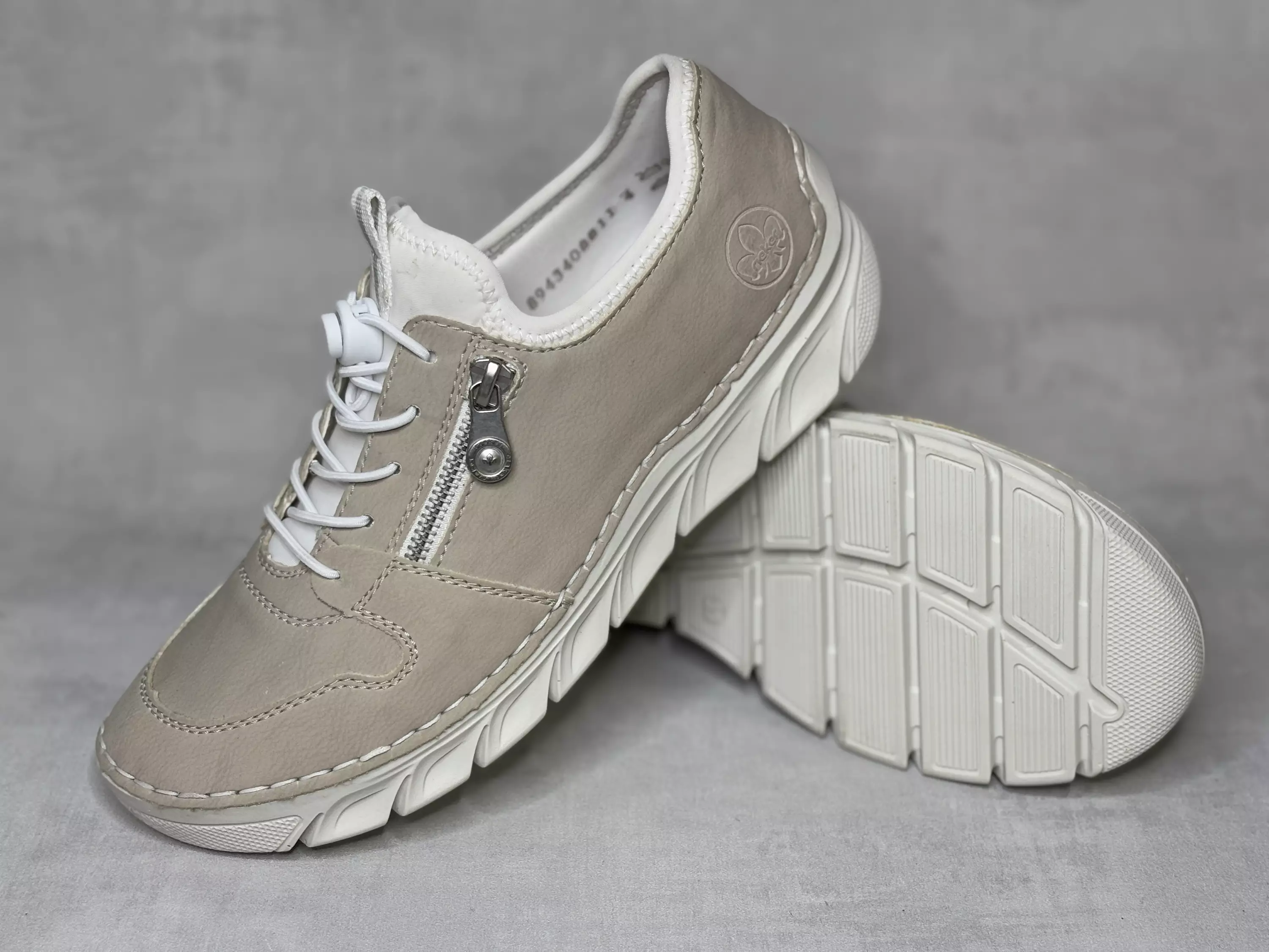 Beiget Riker kävelykengät. Valkoiset säädettävät venykenauhat. Ulkosyrjällä koristevetoketju. Lestimitoitus F½, kannasta kapeahko ja kärjestä leveä. Kannan korkeus noin 3,5cm ja pohjan korkeus päkiän alta noin 2cm.