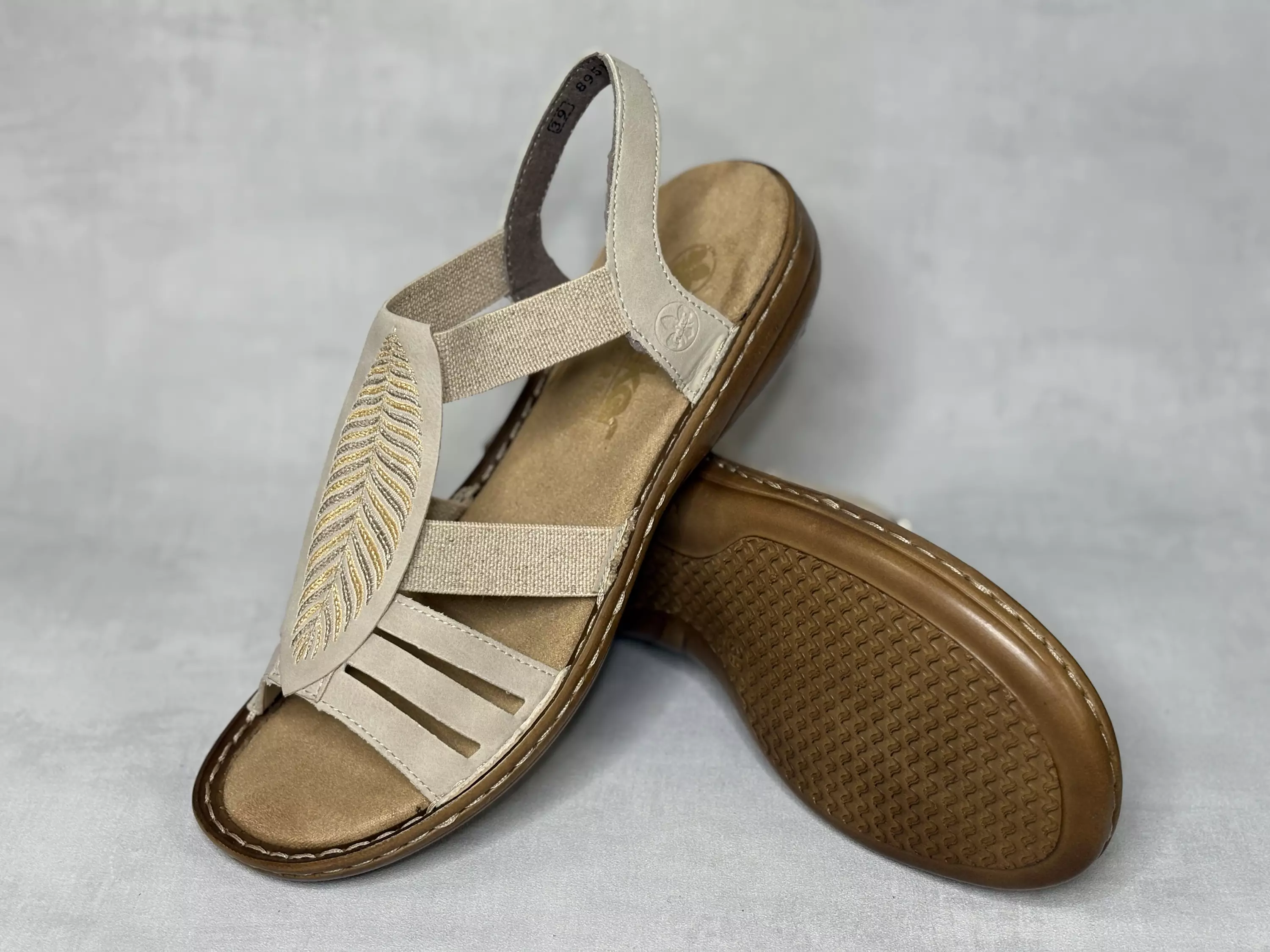 Beiget Rieker sandaalit. Koristeellisella lehti/sulkakuviolla varustetut remmisandaalit. Pellavaa muistuttavat venykeremmit molemmilla puolilla kenkää helpotavat pukemista ja parantavat kenkien istuvuutta. Kantaremmi ja kolme kapeaa kärkiremmiä eivät jousta. Kannan korkeus noin 3,5cm ja pohjan korkeus päkiän alta noin 1,5cm.