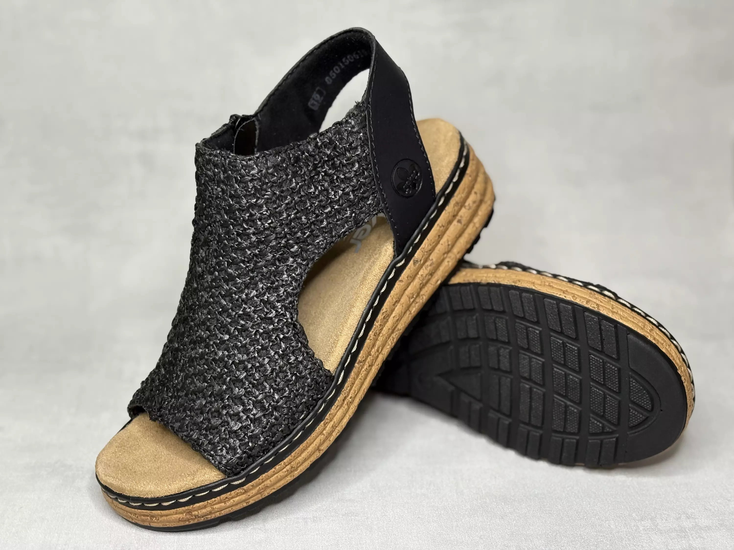 Mustat Rieker sandaali. Punospintaiset sandaalit, joissa matala kiilakorko. Sisäsyrjällä pukemista vauhdittava vetoketju. Kannan korkeus noin 4cm ja pohjan korkeus päkiän alta noin 2,5cm.