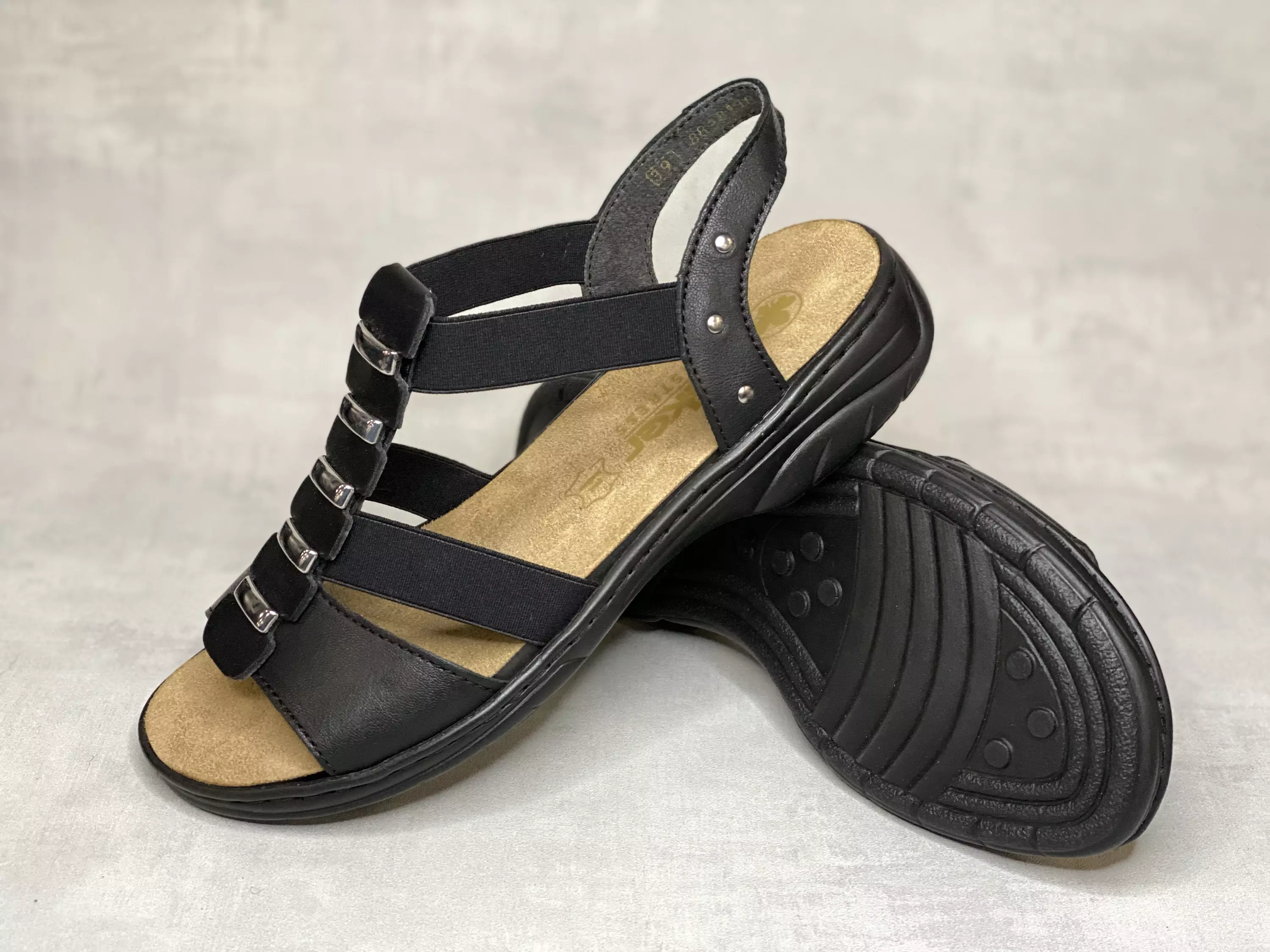 Mustat Rieker sandaalit venykeremmeillä ja hopean värisillä yksityiskohdilla. Venykeremmit helpottavat pukemista ja parantavat istuvuutta. Mahtava valinta niin arkeen kuin juhlaankin.