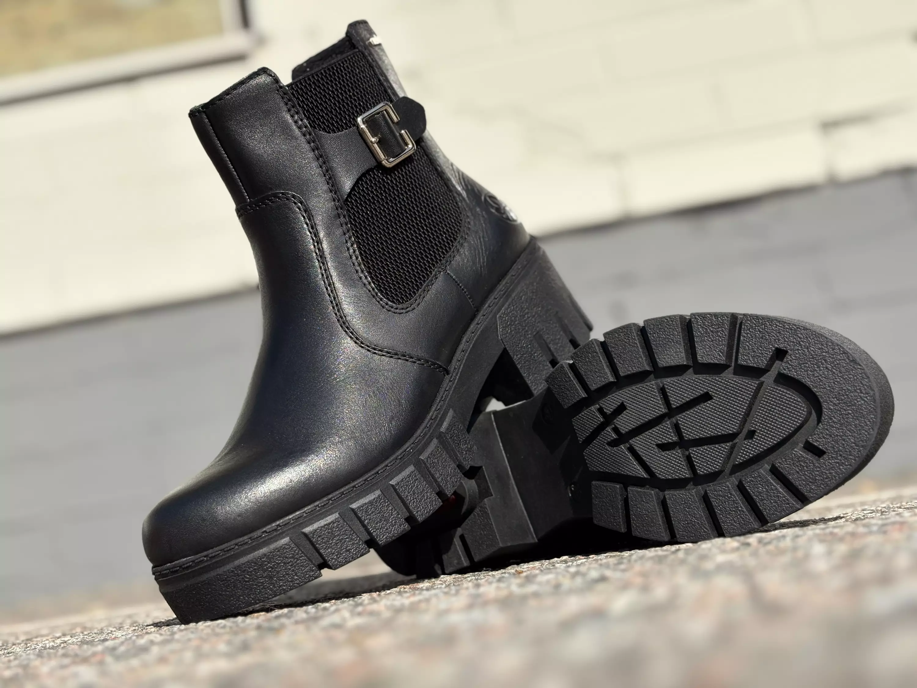 Mustat Rieker nilkkurit. Paksupohjaiset nilkkurit mielenkiintoisesti muotoillulla ulkopohjalla. Ulkosyrjällä venyke, jonka päällä kullan värisellä soljella koristettu remmi. Varren yläreunasa kullan värinen metallinen rieker-logo. Sisäsyrjällä pukemista vauhdittava vetoketju. Lestimitoitus kapea F. Muotoillut Rieker antistress-pohjalliset ovat irrotettavat, joten tarvittaessa vaihdat kenkiin omia tarpeitasi parhaiten vastaavat pohjalliset. Kannan korkeus noin 5,5cm ja pohjan korkeus päkiän alta noin 3cm.