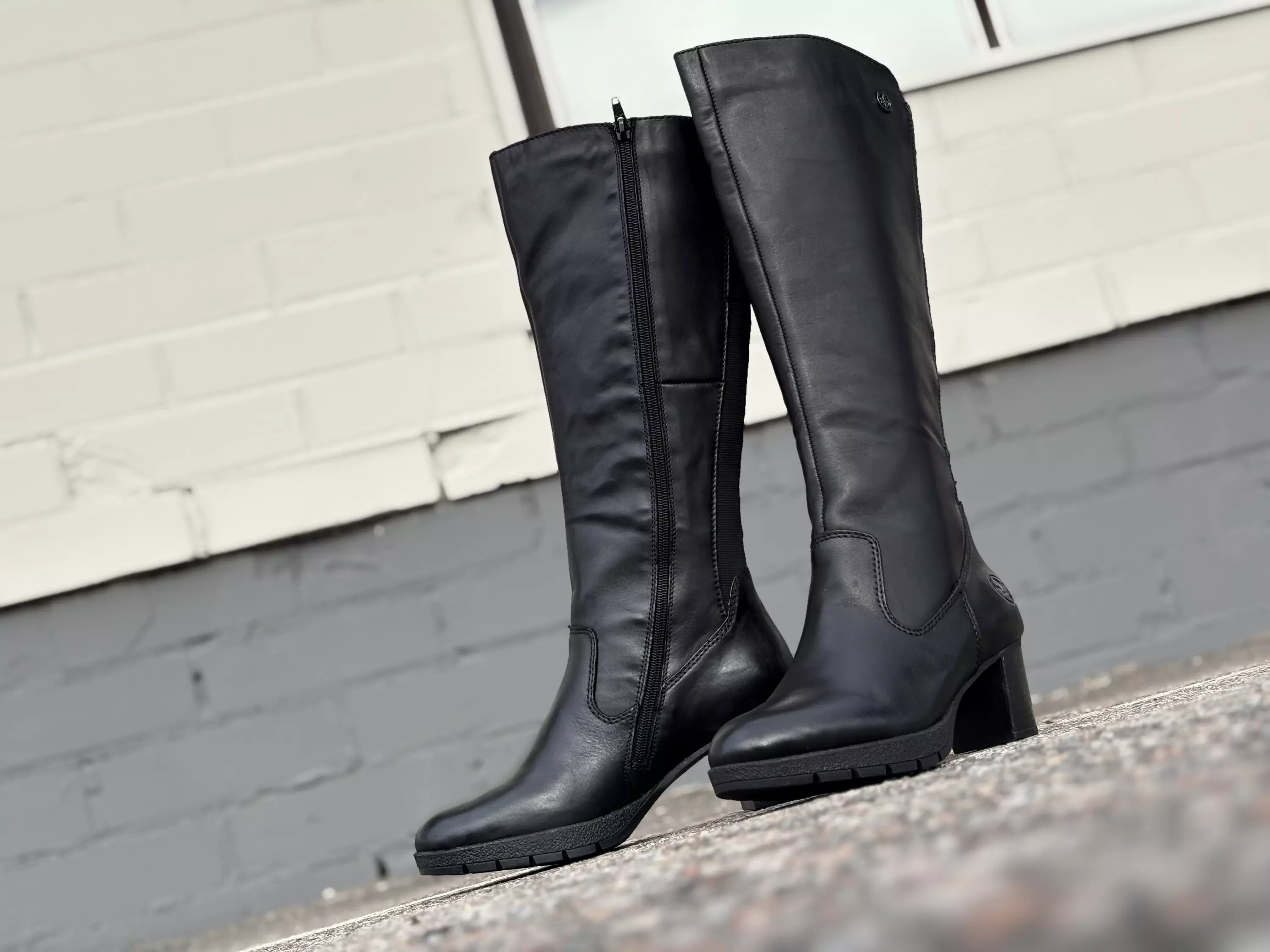 Mustat Rieker saappaat. Korolliset pitkävartiset nahkasaappaat. Tyylikäs hieman kapeneva kärki. Pehmeä, matalanukkainen tekoturkisvuori. Varren sisäsyrjällä pukemista helpottava vetoketju. Varren takaosassa mustat venykkeet, jotka parantavat kenkien istuvuutta. Vaihdettavat pohjalliset, joten tarpeen vaatiessa sujautat kenkiin omia tarpeitasi parhaiten vastaavat pohjalliset. Lestimitoitus normaali (G). Kannan korkeus noin 6cm ja pohjan korkeus päkiän alta noin 2cm.