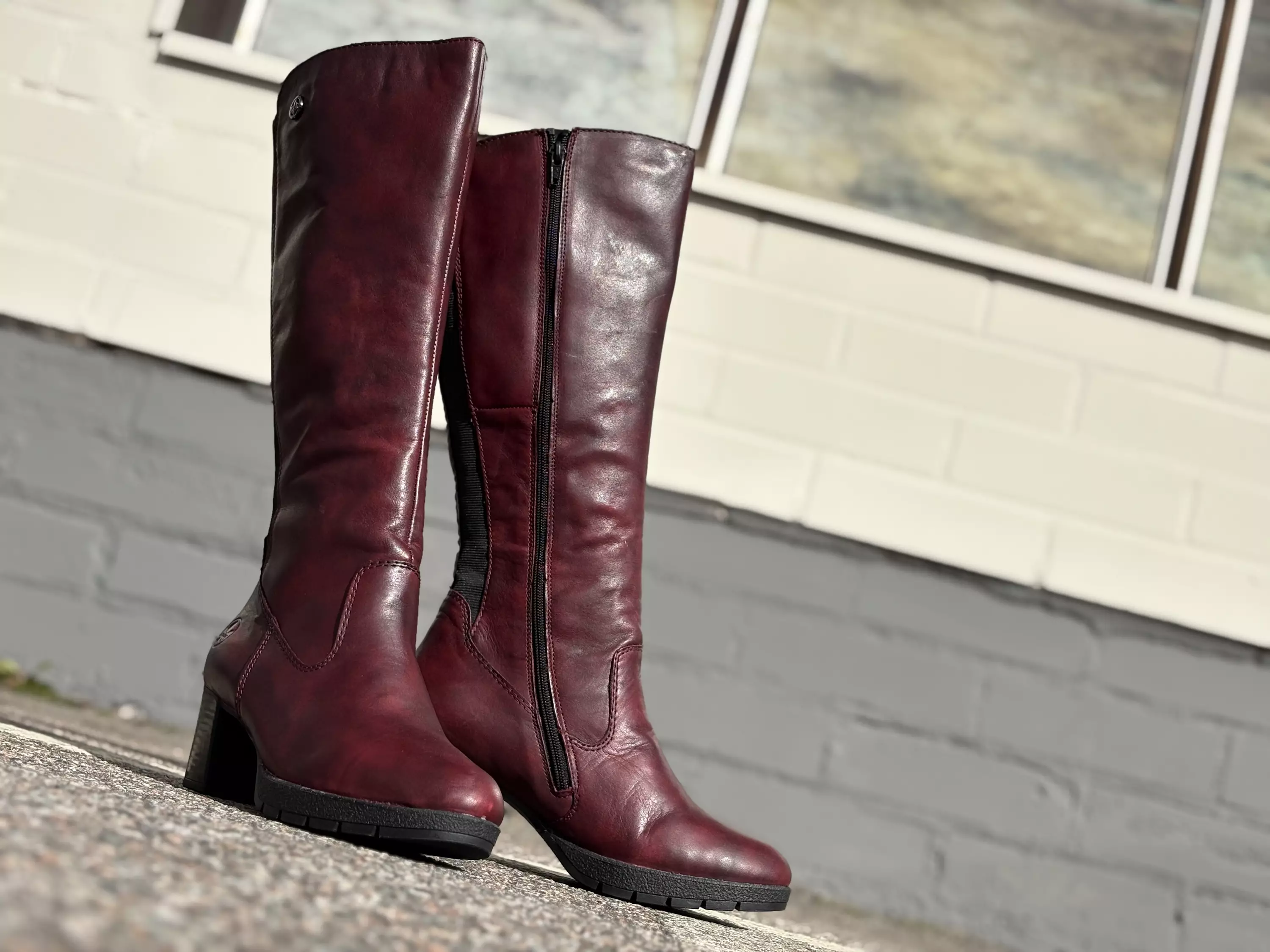 Tummanpunaiset Rieker saappaat. Korolliset pitkävartiset nahkasaappaat. Upea eläväpintainen väri ja tyylikäs hieman kapeneva kärki. Pehmeä, matalanukkainen tekoturkisvuori. Varren sisäsyrjällä pukemista helpottava vetoketju. Varren takaosassa mustat venykkeet, jotka parantavat kenkien istuvuutta. Vaihdettavat pohjalliset, joten tarpeen vaatiessa sujautat kenkiin omia tarpeitasi parhaiten vastaavat pohjalliset. Lestimitoitus normaali (G). Kannan korkeus noin 6cm ja pohjan korkeus päkiän alta noin 2cm.