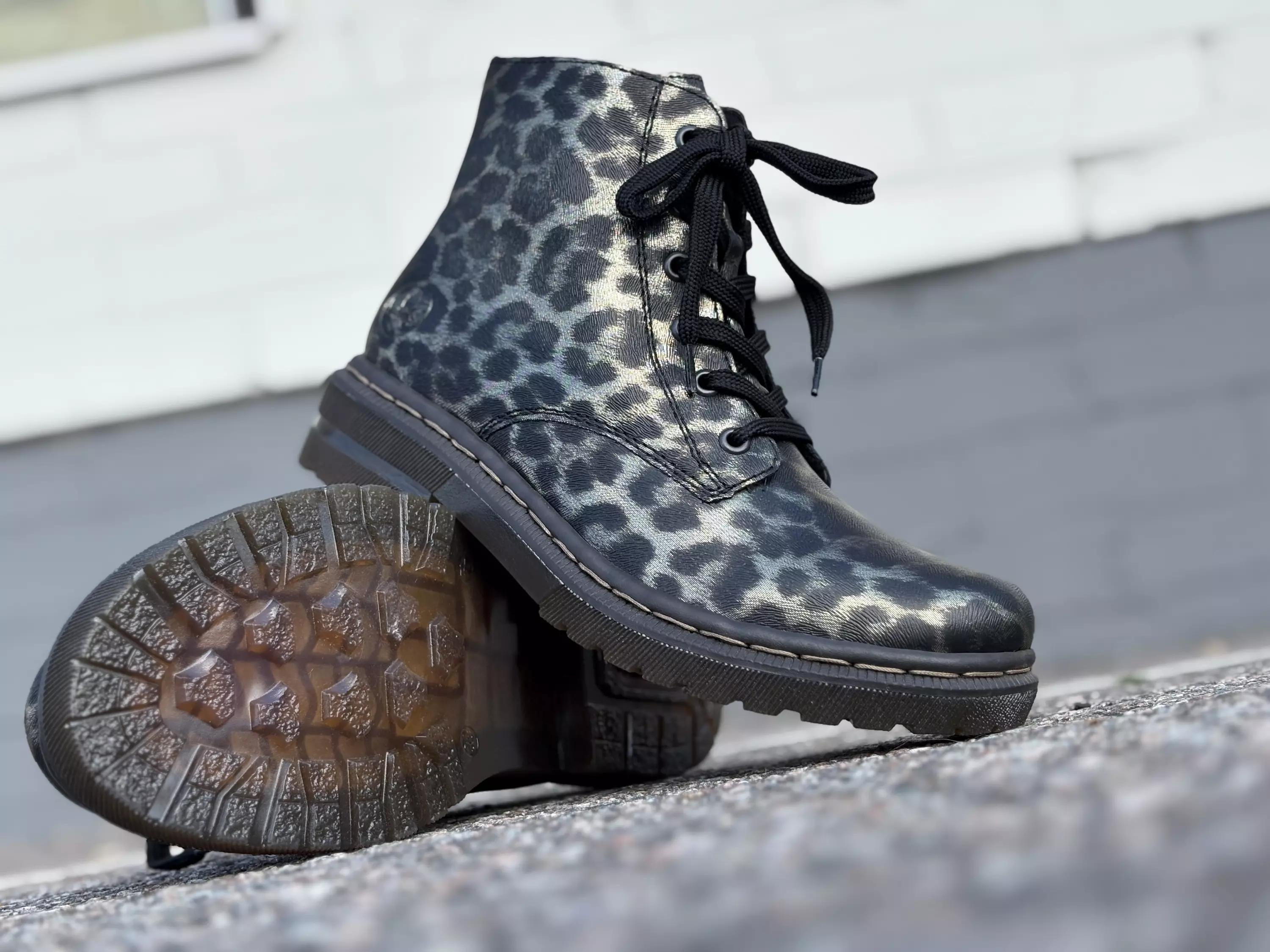 Leopardi Rieker maiharit. Matalavartiset maiharit kiiltävälä leopardi-täplin kuvioidulla pinnalla. Sisäsyrjällä pukemista vauhdittava vetoketju. Nauhojen avulla kengät on helppo säätää omaan jalkaan sopivan kireälle. Lestimitoitus kapeahko F½. Tekstiilivuori ja huopapohjaiset kiinteät pohjalliset. Kannan korkeus noin 4cm, pohjan korkeus päkiän alta noin 2cm.