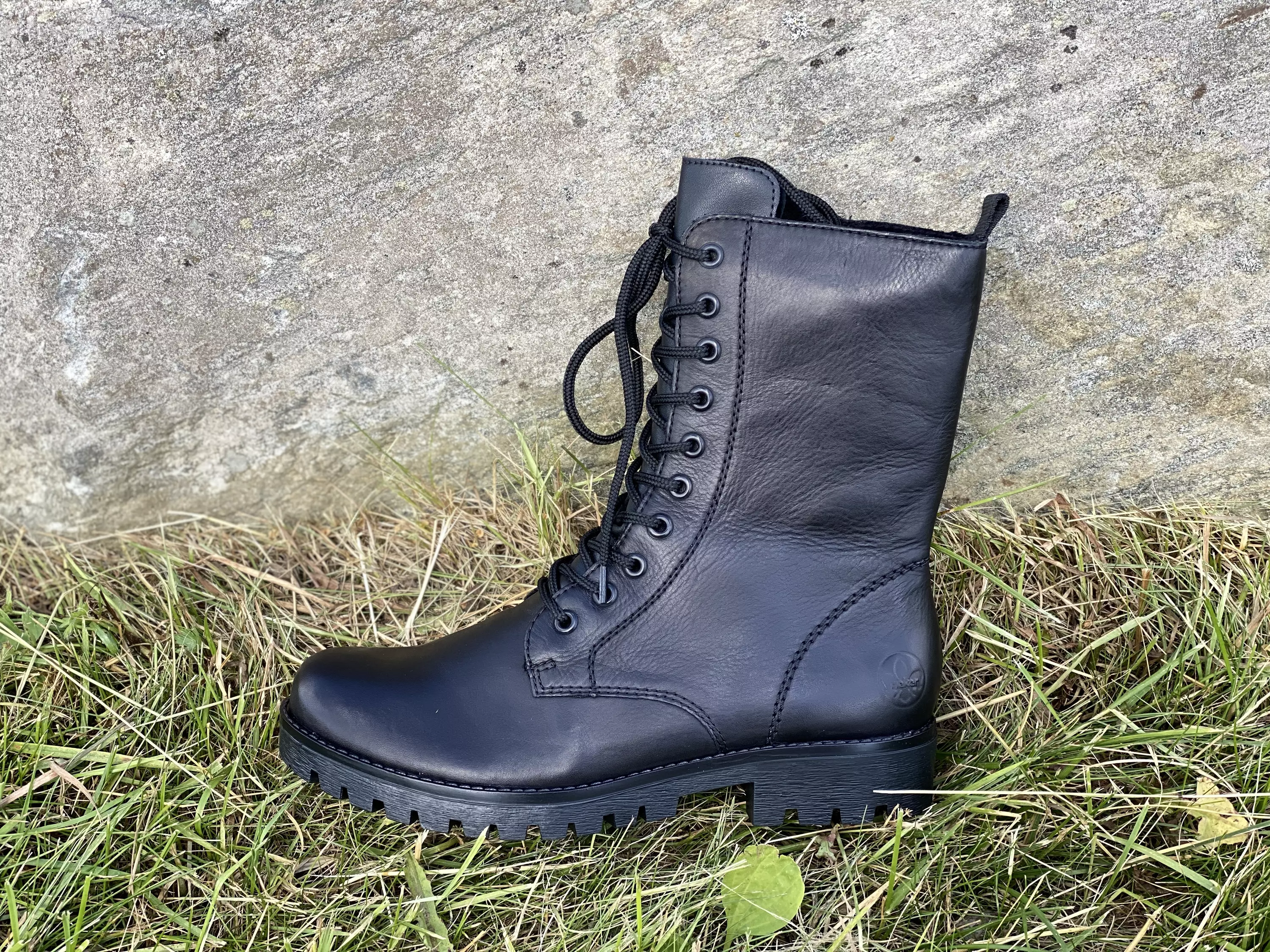 Mustat Rieker maiharit. Perusmaiharit eivät tästä juuri parane! Samaan aikaan sopivan siro ja toisaalta asenteikas ulkonäkö! Maihareiden pinta on nahkaa ja nauhoissa on reilusti säätövaraa. Sisävuori on matalanukkaista teddyä. Kiinteässä pohjallisessa on huopapinta. Sisäsyrjältä löytyy pukemista helpottava vetoketju.