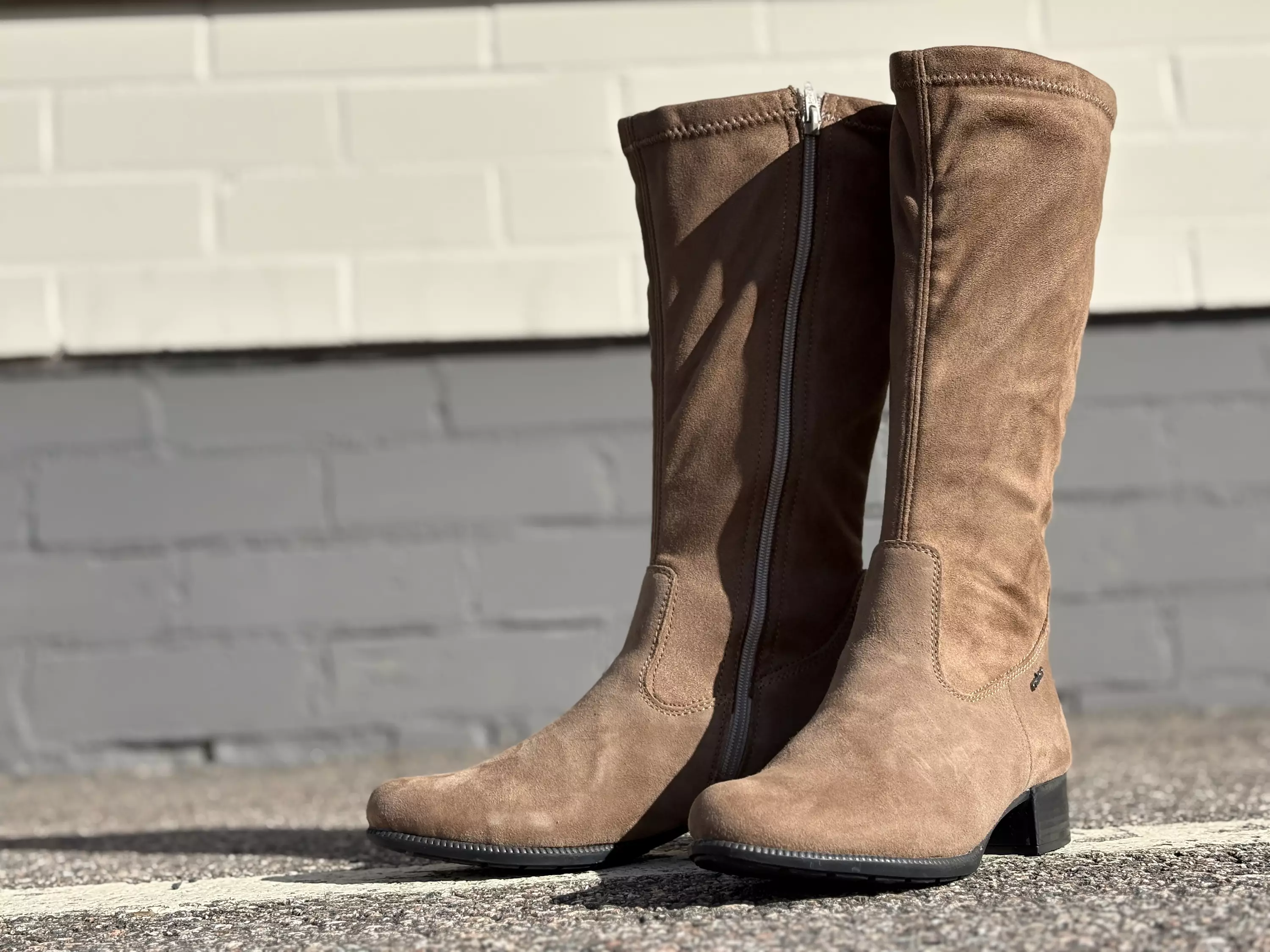 Beiget pitkävartiset Rieker saappaat. Matalakorkoiset saappaat tekstiilisellä samettivuorilla. Kärkiosa nahkaa, synteettinen varsi. Sisäsyrjällä pukemista vauhdittava vetoketju. Ulkosyrjällä nilkassa metallinen rieker-logo. Kannan korkeus noin 3,5cm ja pohjan korkeu päkiän alta noin 1cm. Lestimitoitus F (kapea).