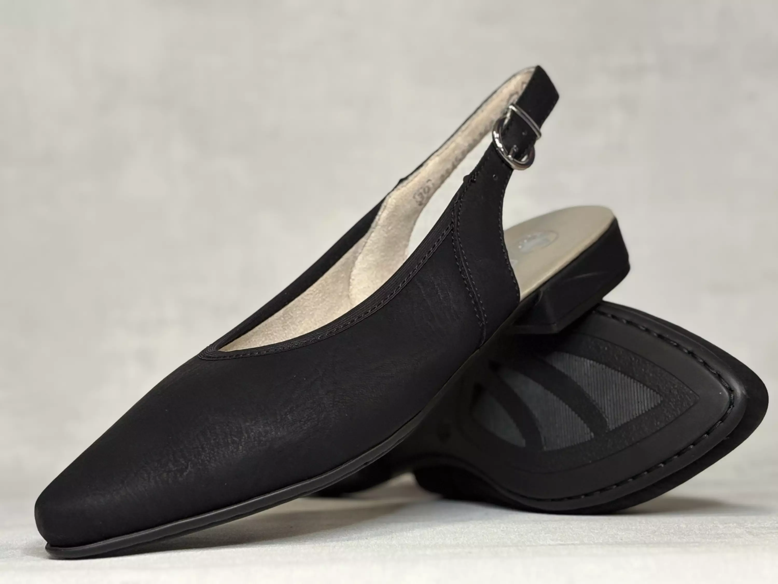 Mustat matalakorkoiset Rieker sling back avokkaat. Tyylikkäät kapeakärkiset avokkaat solkisäätöisellä takaremmillä. Solki on kiinni pienessä venykkeessä. Helpottaa pukemista ja parantaa istuvuutta. Lestimitoitus kapeahko F½. Kannan korkeus noin 2cm ja pohjan kokreus päkiän alta noin 0,5cm.