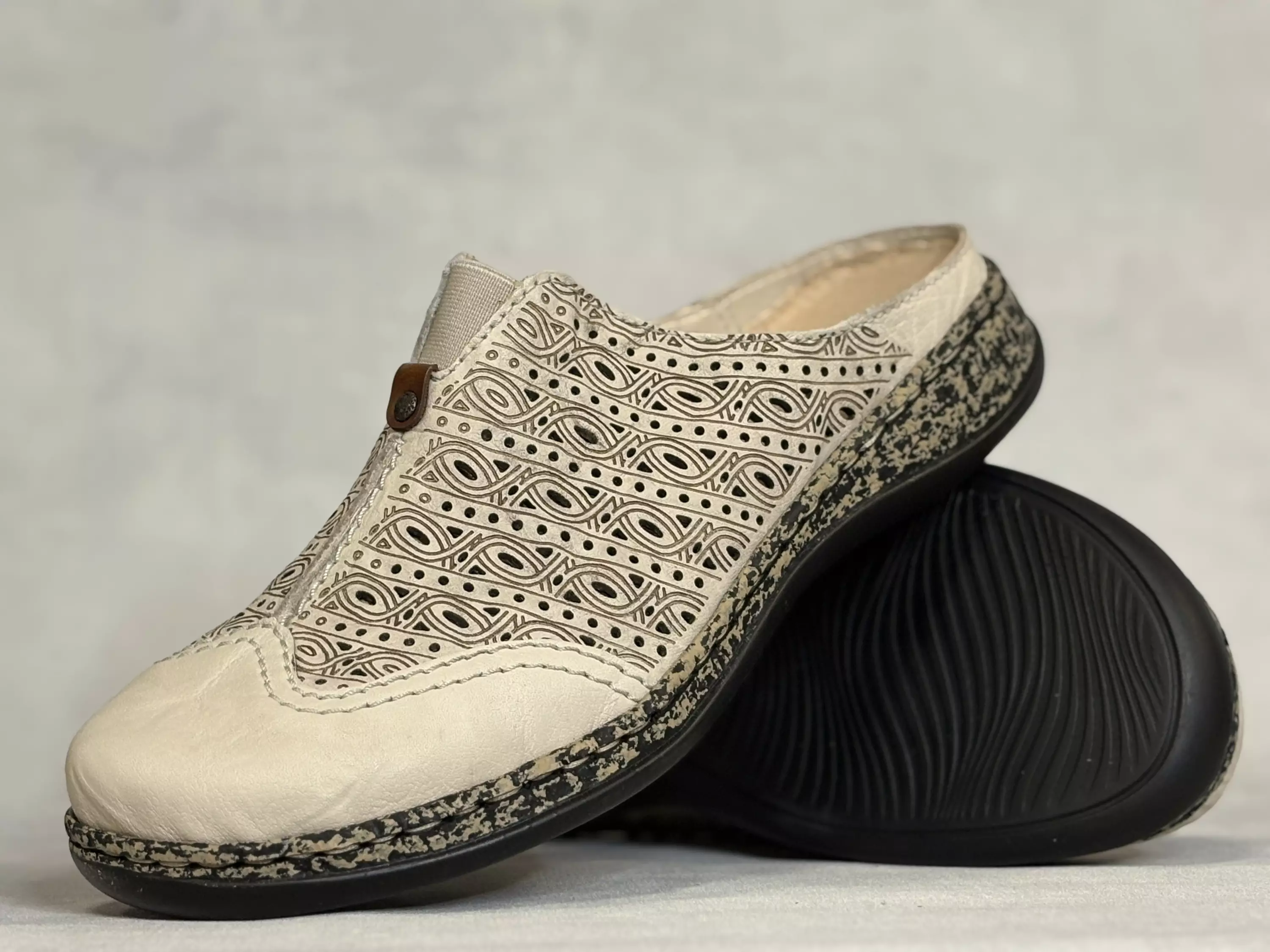 Beiget Rieker pistokkaat. Reikäkuvioitu pinta erilaisilla kuvioilla. Nahkainen sisäpohja. Lestimitoitus kapea F. Kannan korkeus noin 3cm ja pohjan korkeus päkiän alta noin 1cm.