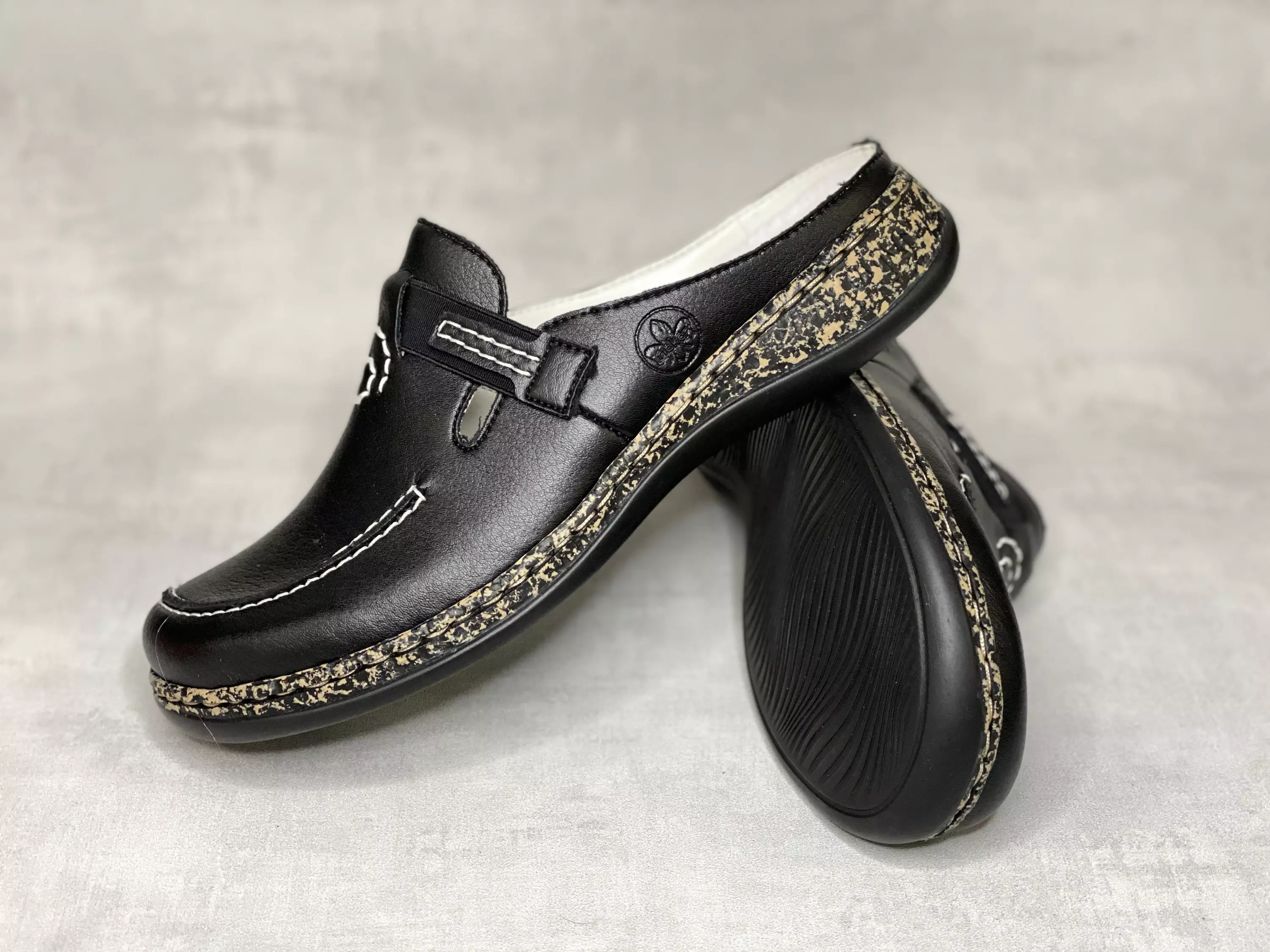 Mustat Rieker pistokkaat. Kenkien pinnassa on valkoiset koristetikkaukset. Pääliremmissä joustava venyke. Normaali lesti. Kannan korkeus noin 3cm, pohjan korkeus päkiän alta noin 1cm.