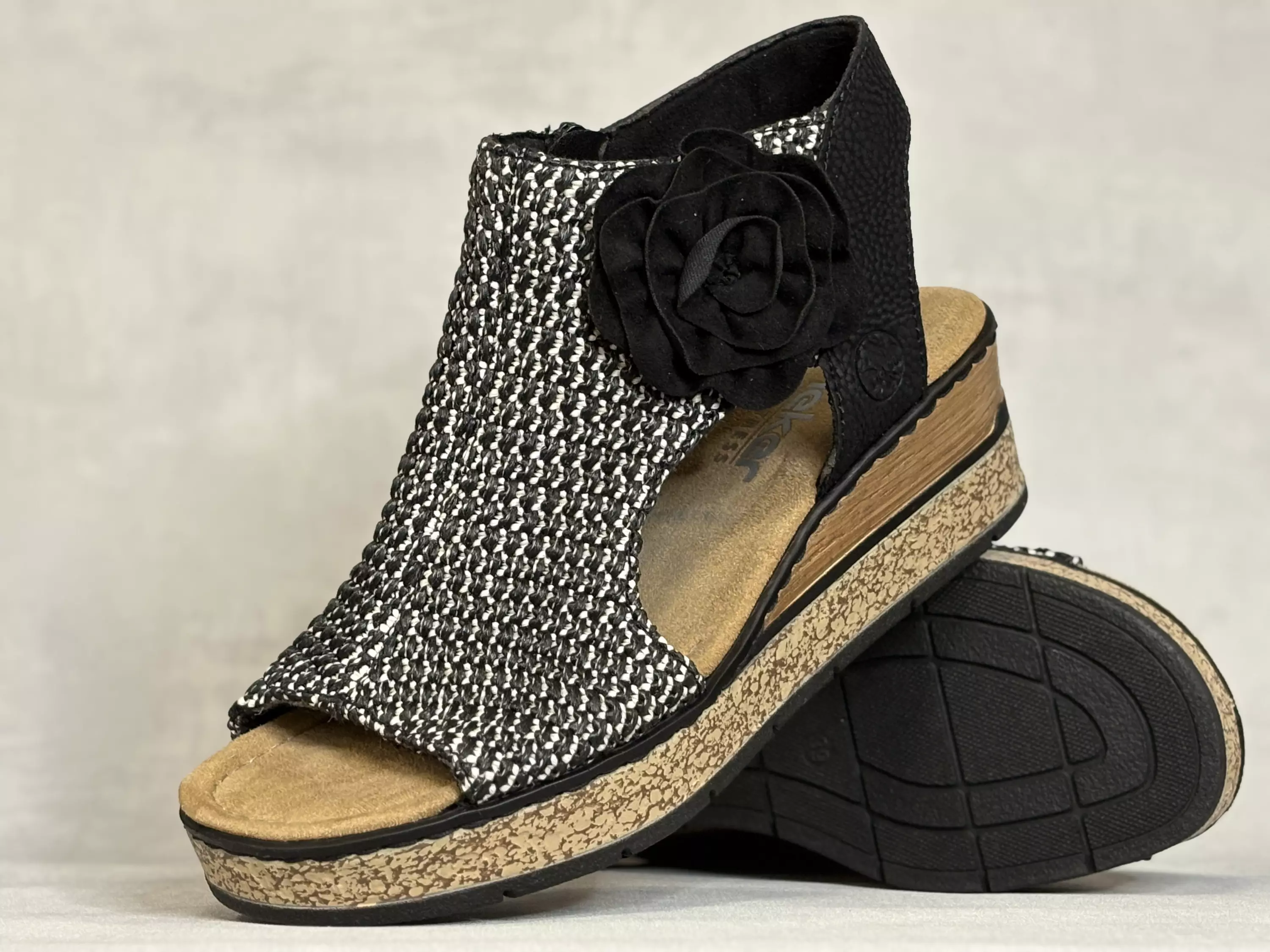 Musta-valkoiset Rieker sandaalit. Kiilapohjaiset punospintaiset sandaalit. Ulkosyrjällä koriste-ruusuke. Sisäsyrjällä pukemista helpottava vetoketju. Lestimitoitus kapeahko F½. Kannan korkeus noin 5,5cm ja pohjan korkeus päkiän alta noin 3cm.
