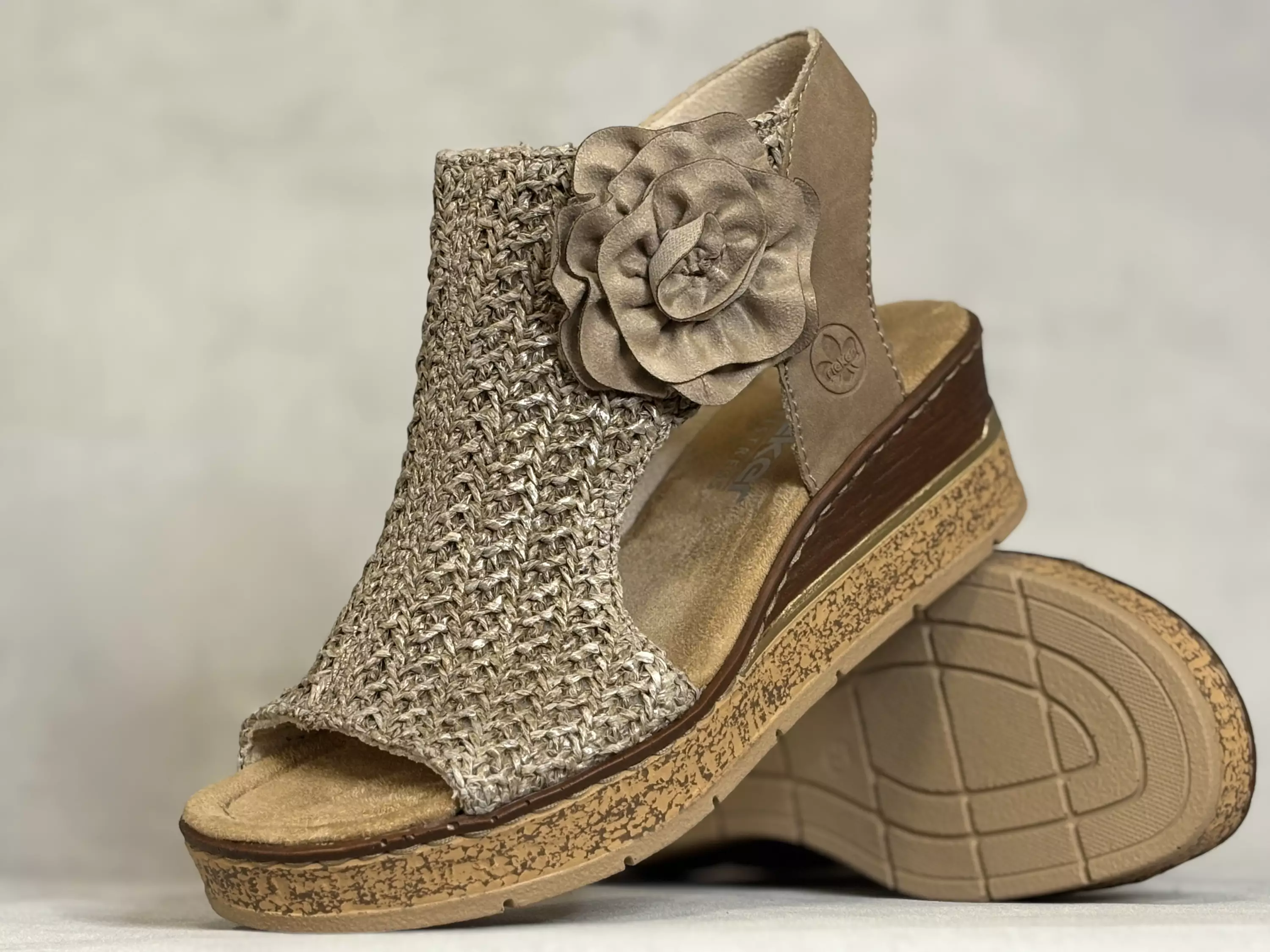 Beiget Rieker sandaalit. Kiilapohjaiset punospintaiset sandaalit. Ulkosyrjällä koriste-ruusuke. Sisäsyrjällä pukemistahelpottava vetoketju. Lestimitoitus kapeahko F½. Kannan korkeus noin 5,5cm ja pohjan korkeus päkiän alta noin 3cm.