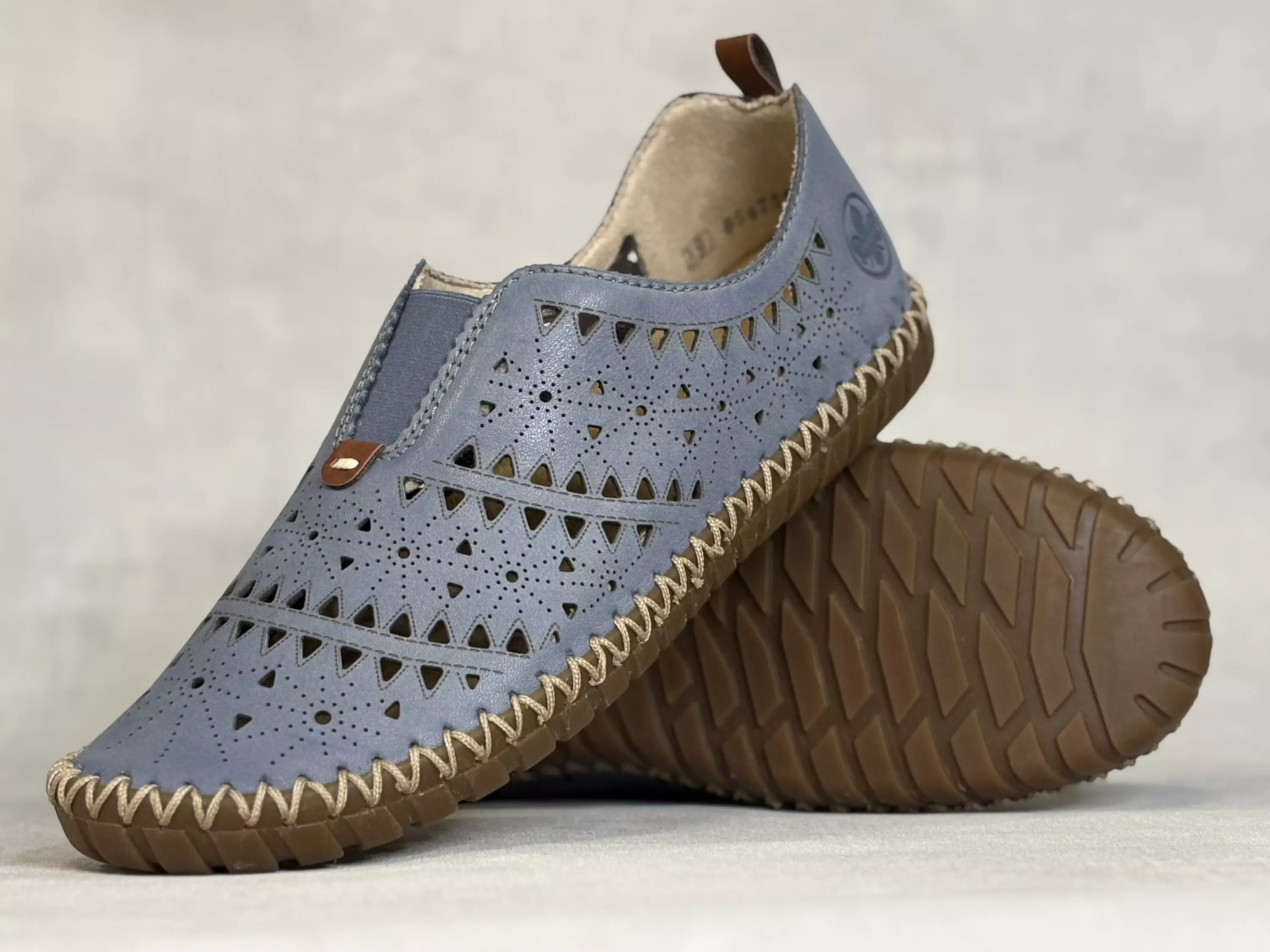 Vaaleansiniset Rieker kävelykengät. Perferoitu reikäkuvioinen nahkapinta. Päällä pukemista helpottava ja istuvuutta parantava venyke. Vaihdettavat pohjalliset, jodien tilalle sujautat tarvittaessa omia tarpeitasi parhaiten vastaavat pohjalliset. Kannan korkeus noin 2cm ja pohjan korkeus päkiän alta noin 1,5cm.