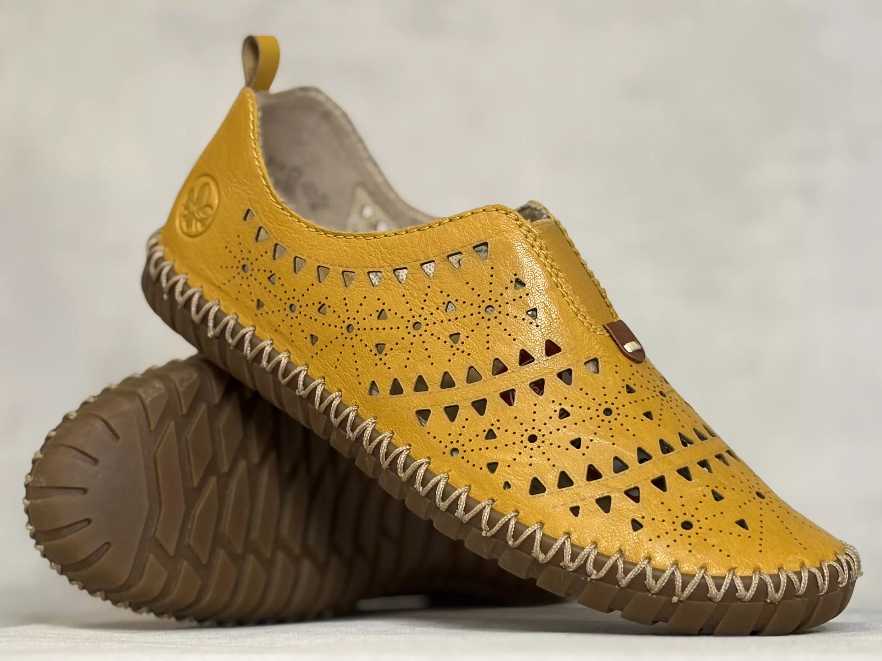 Keltaiset Rieker kävelykengät. Perferoitu reikäkuvioinen nahkapinta. Päällä pukemista helpottava ja istuvuutta parantava venyke. Vaihdettavat pohjalliset, jodien tilalle sujautat tarvittaessa omia tarpeitasi parhaiten vastaavat pohjalliset. Kannan korkeus noin 2cm ja pohjan korkeus päkiän alta noin 1,5cm.