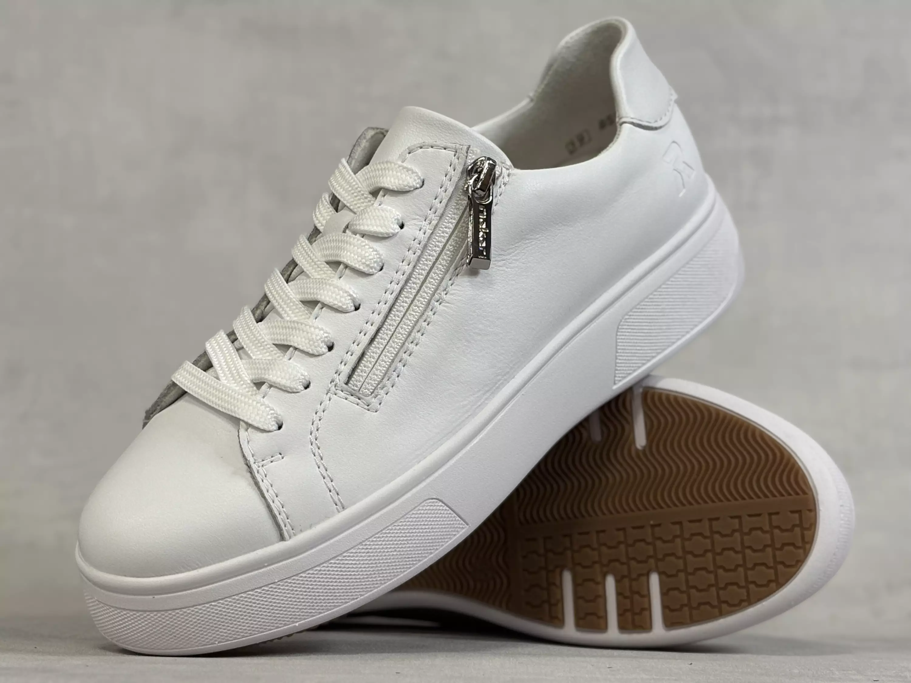 Valkoiset Rieker kävelykengät. Nahkaiset nauhalliset tennarit ovat saaneet ulkosyrjälleen pukemista vauhdittavan vetoketjun. Kevyesti muotoillut Rieker Soft-pohjalliset ovat vaihdettavat, joten tarvittaessa vaihdat kenkiin omia tarpeitasi parhaiten vastaavat pohjalliset. Lestimitoitus normaalia hieman kapeampi F½. Kannan korkeus noin 4cm ja pohja korkeus päkiän alta noin 3cm.